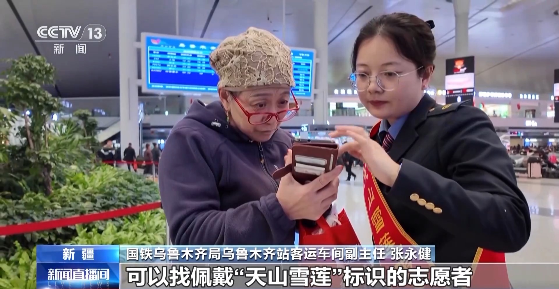 国铁乌鲁木齐局乌鲁木齐站客运车间副主任 张永健:老年旅客群体如果在车站遇到问题,可以找佩戴“天山雪莲”标识的志愿者。志愿者们也会协助腿脚不便、身体不适、老年旅客安排“绿色通道”快速进出站。