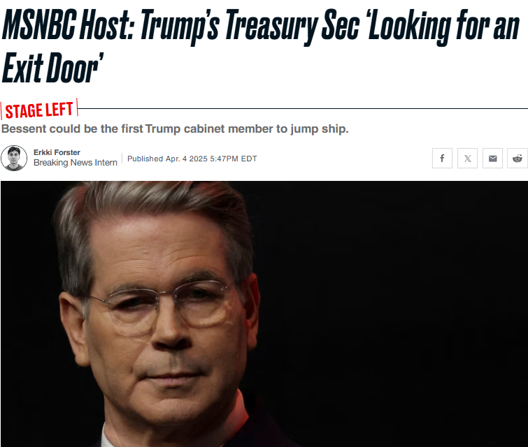 美国微软—全国广播公司主持人斯蒂芬妮·吕勒4日说,美国财政部长斯科特·贝森特无法忍受特朗普政府“荒谬的(对等)关税算法”,已打算辞职不干。