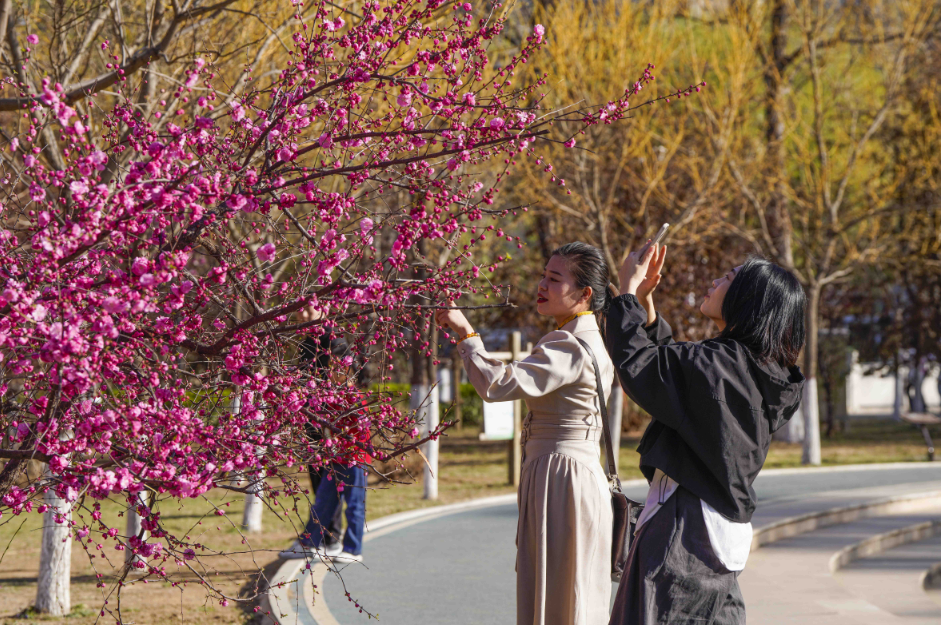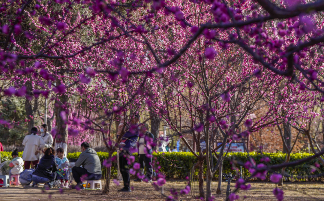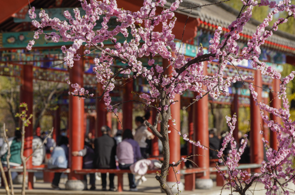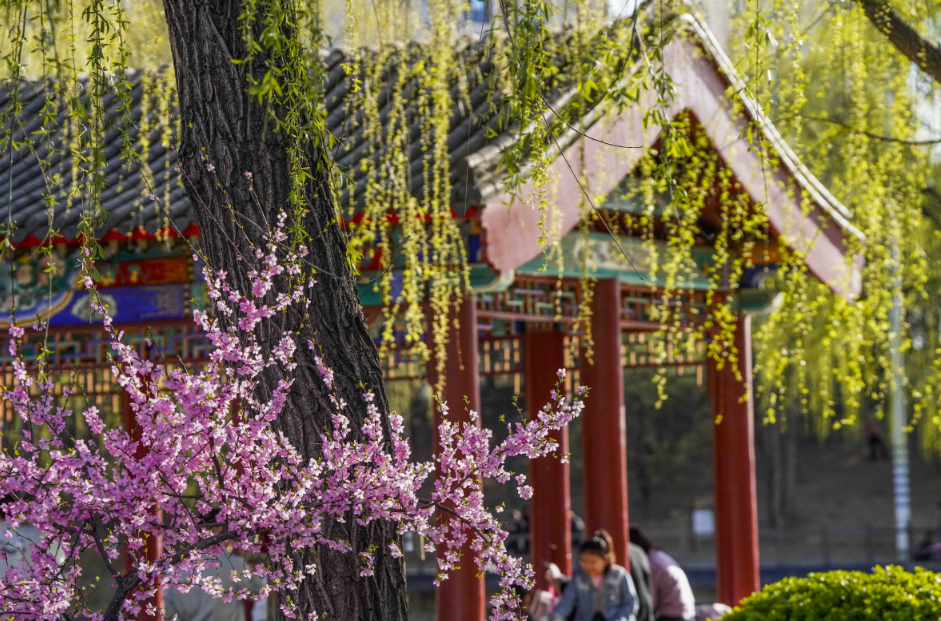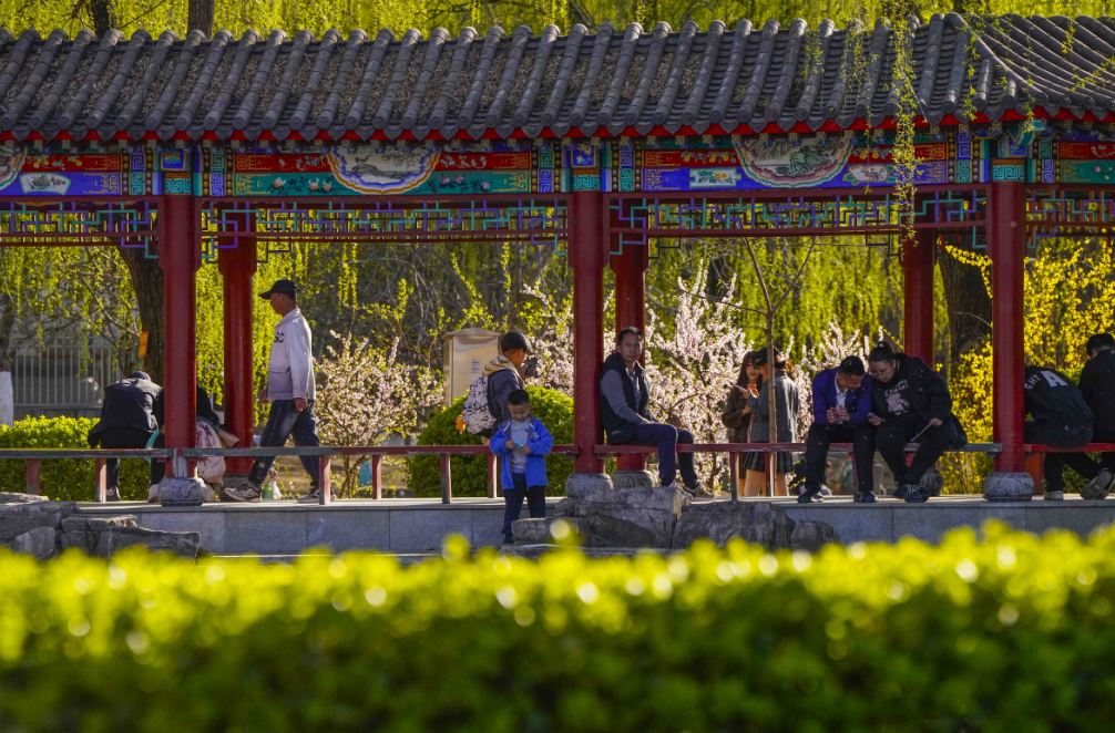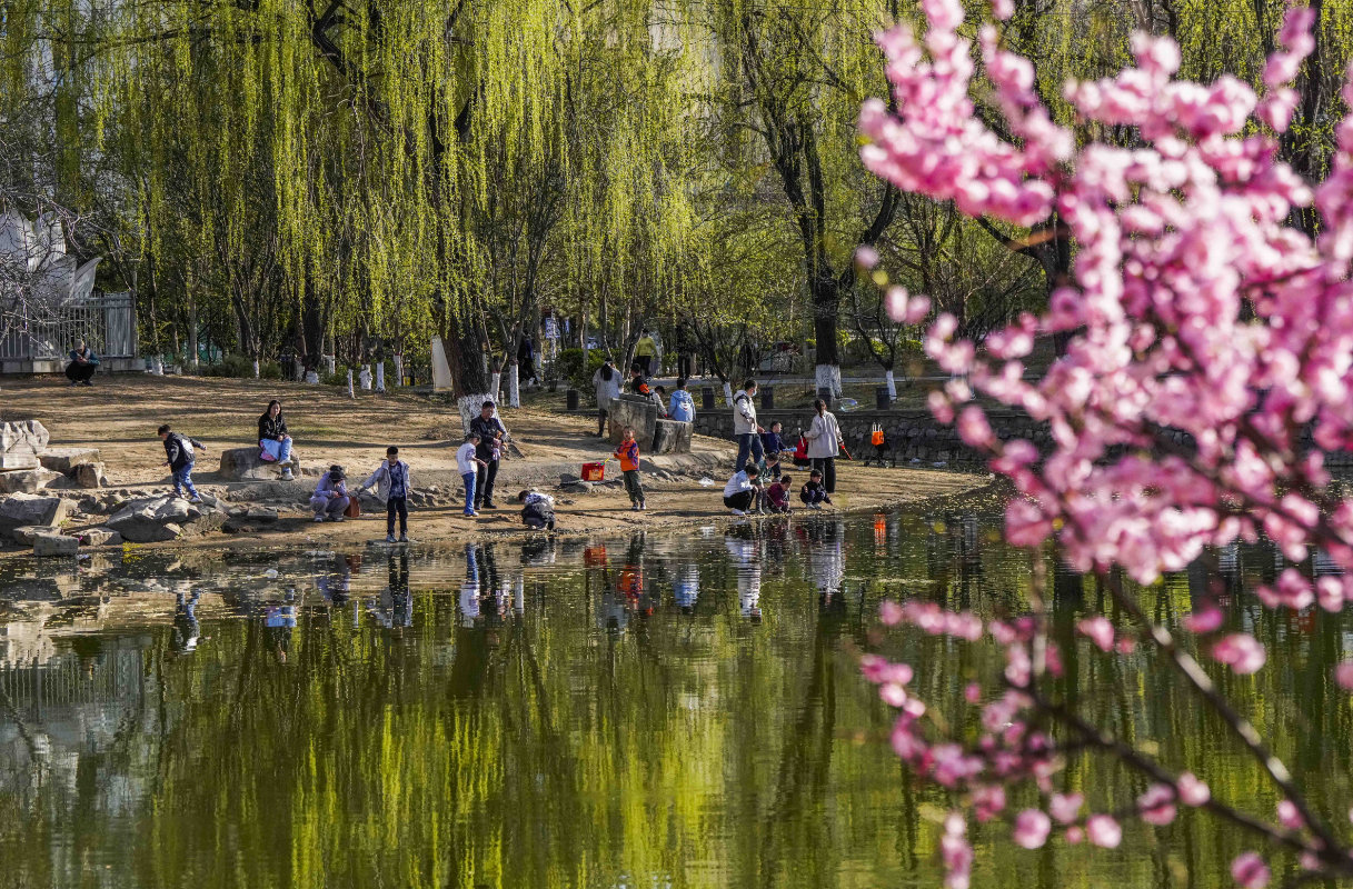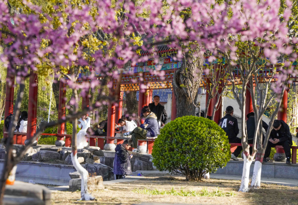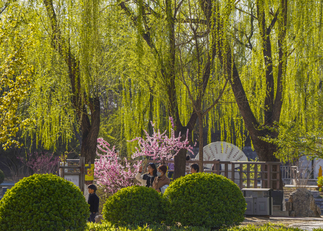 4月5日正值清明假期,河北遵化市人民公园花红柳绿,市民纷纷来到公园赏花游玩,乐享美景。