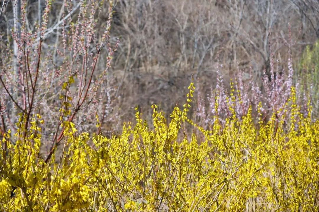 山风抚过,山桃花瓣四处纷飞,如粉雪倾泻,又像远方的蝴蝶赶来赴一场春日宴。道路两旁的连翘势头正盛,满目金黄,枝条在风中轻轻摇晃,抖落满地碎金箔般的光影。
