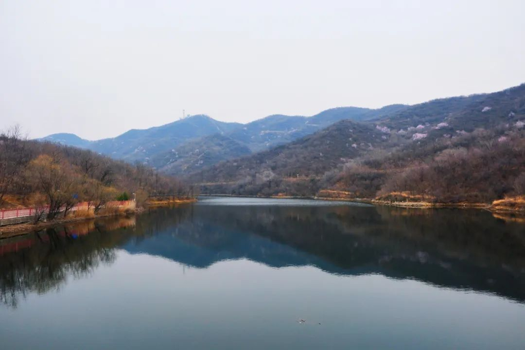 南马场水库像一块明亮清透的宝石镶嵌在群山之间。湖面平静无波,偶有涟漪泛起,像绸缎上淡淡起伏的皱褶。