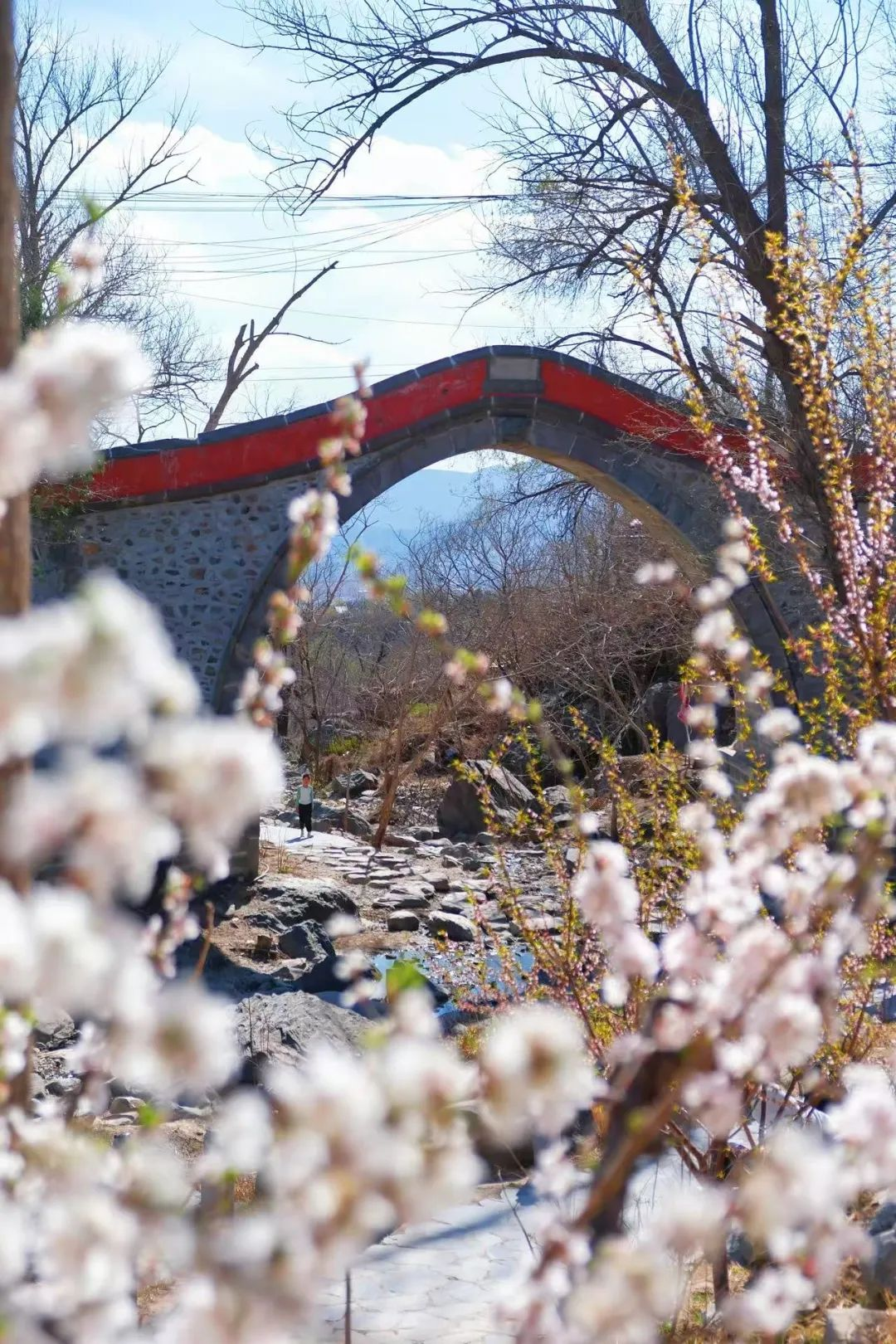 山桃丛中,隐匿着这座始建于明代的石桥——万善桥。时光在古桥的肌理上留下痕迹,但它只是静卧在溪水之上,任凭世间物转星移。桥下溪水细细流淌,阳光潜入水底,鹅卵石的斑斓色彩更加鲜亮清透。