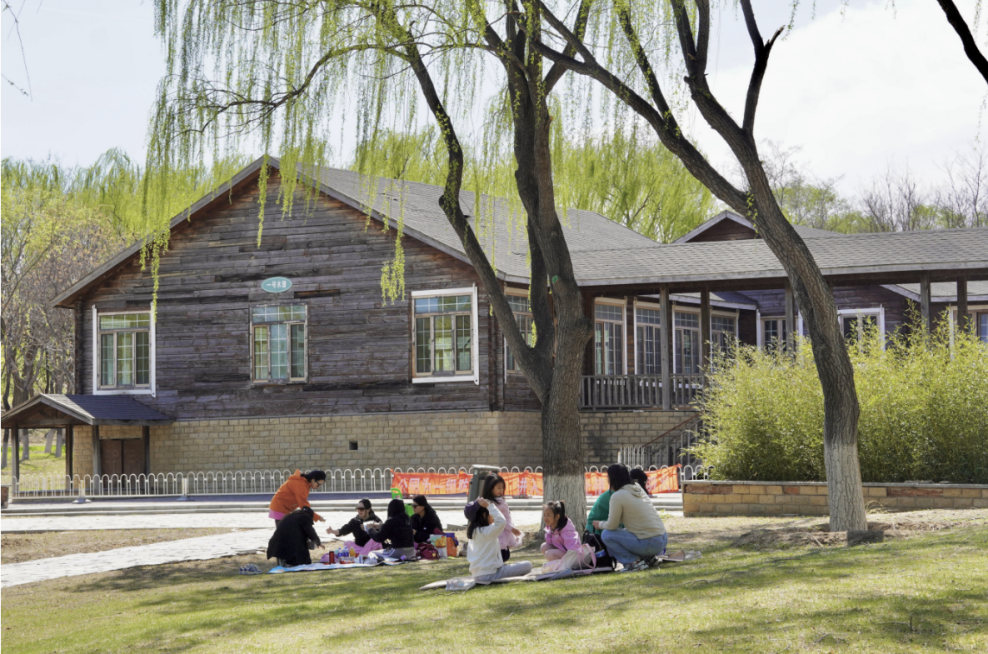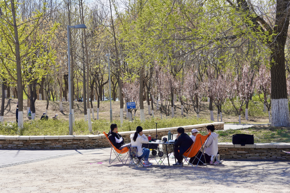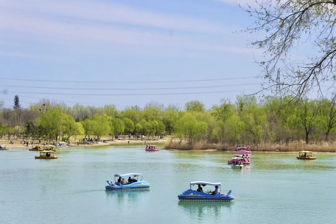 湖畔的绿荫步道上,跑步爱好者的身影掠过路旁的桃花林,惊起一地春雪。湖边草坪露营区内,露营爱好者们携家人一起来享受春天与美食,大大小小、颜色各异的帐篷如花绽放。来自天津的刘先生一家铺开野餐垫,“这里既能赏皇家园林气韵,又有现代休闲设施,老人孩子各得其乐。”