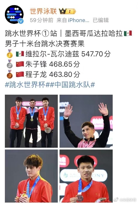 2025年世界泳联跳水世界杯瓜达拉哈拉站男子十米台跳水决赛中,墨西哥选手维拉尔·瓦尔迪兹以547.70分夺得金牌,中国选手朱子锋以468.65分摘银,程子龙463.80分获得铜牌。
