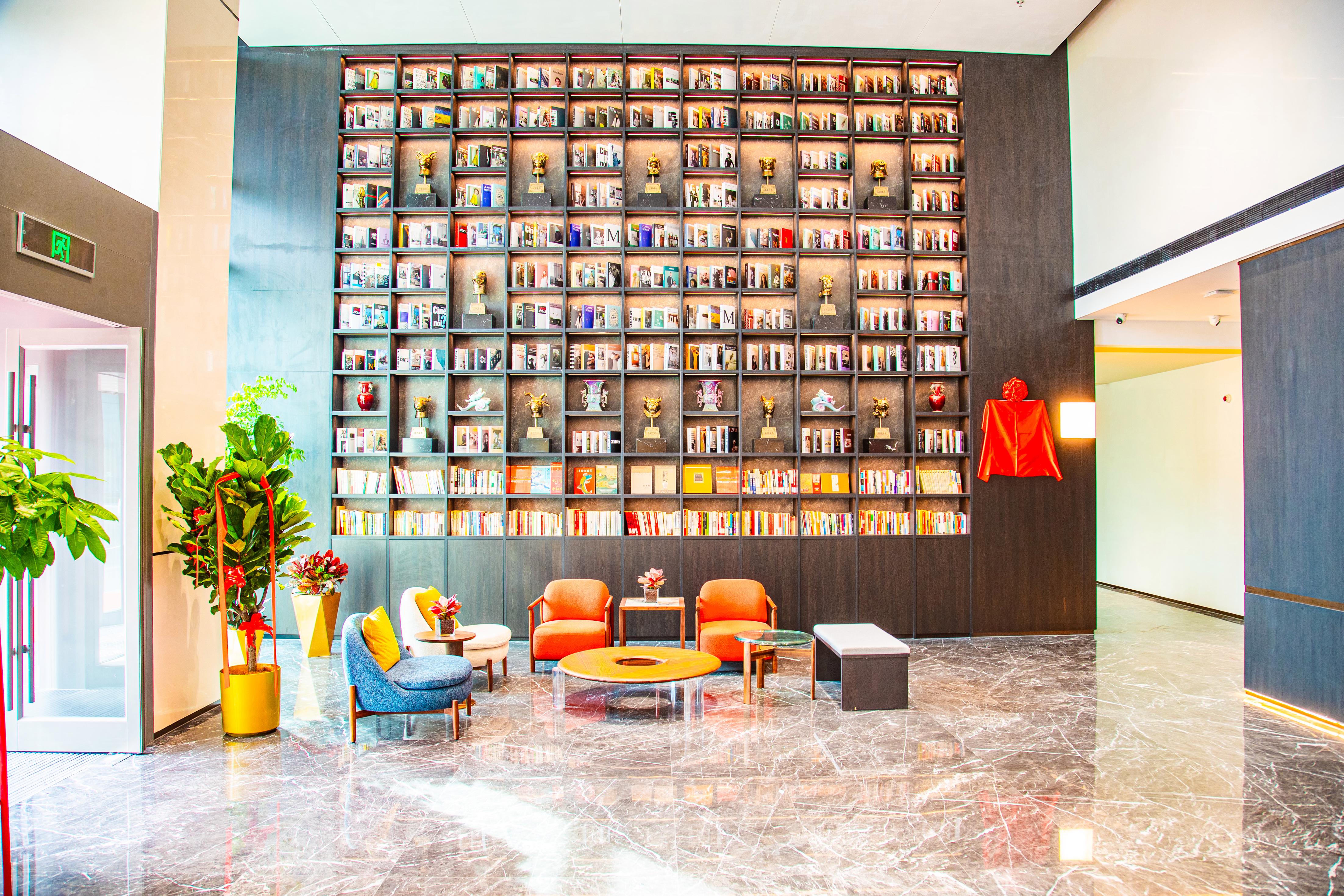 走进丰汇酒店大堂,静立的红枫和潺潺的流水立即带给人禅意的静谧之感,右手边是一片片景德镇陶瓷马赛克复刻出的故宫朱墙金瓦,左手边整面墙的书架上摆满了古今中外各类图书,其间穿插摆放的12件兽首模型和精美的瓷器让酒店的文化气息更浓厚。书架旁是一个小型书吧,铜钱样式的圆形书桌、新中式实木沙发搭配简洁的红黄蓝三色坐垫和靠枕,光影透过玻璃幕墙洒落书吧,让人很想在这里静下来看书休憩。