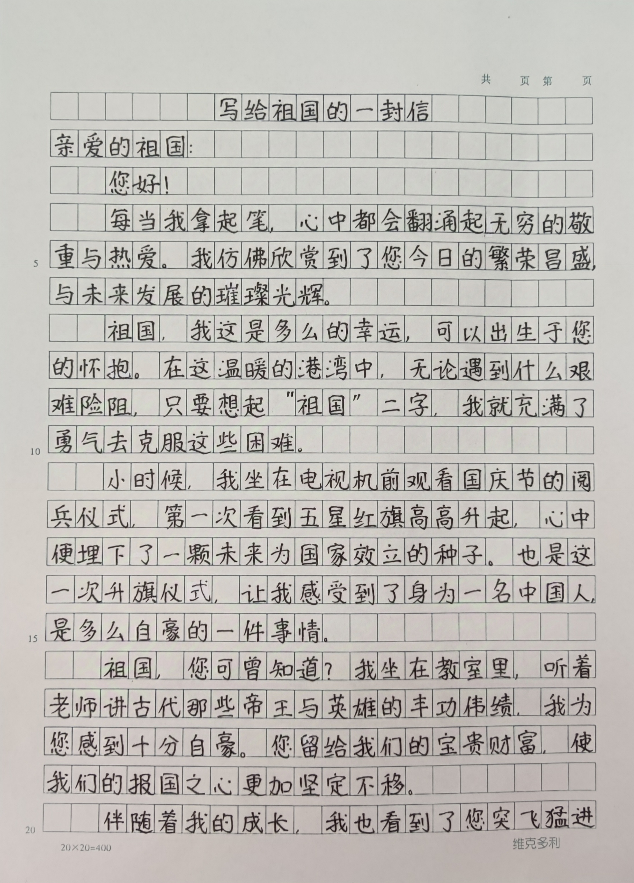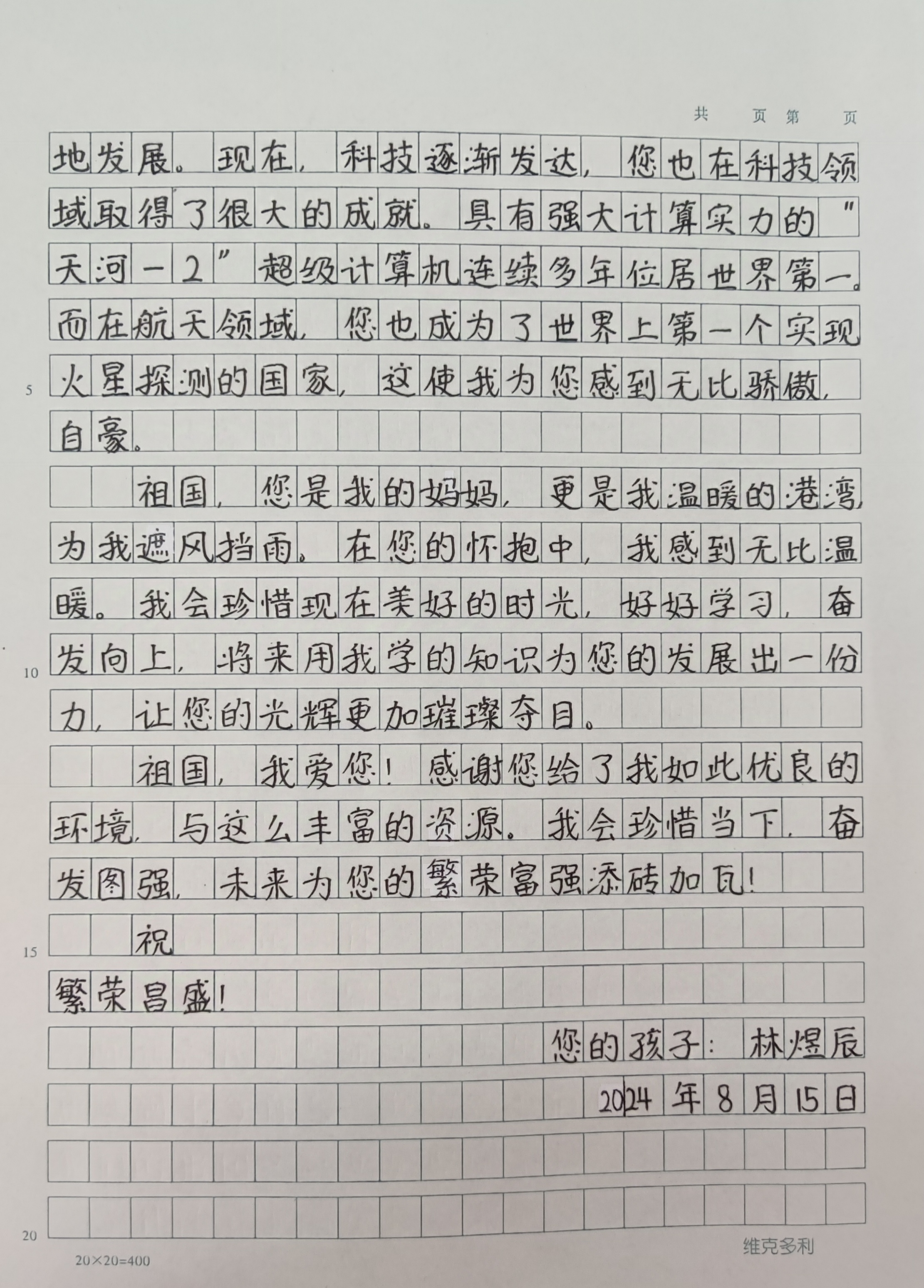 今天这幅AI绘画作品的原型来自北京市史家小学通州分校六年级(1)班林煜辰的书信作品《写给祖国的一封信》。