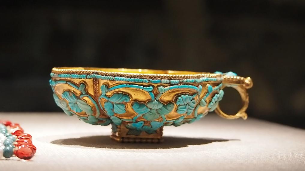 修复后的镶嵌绿松石四曲鋬指金杯。(新华社记者白玛央措 摄)