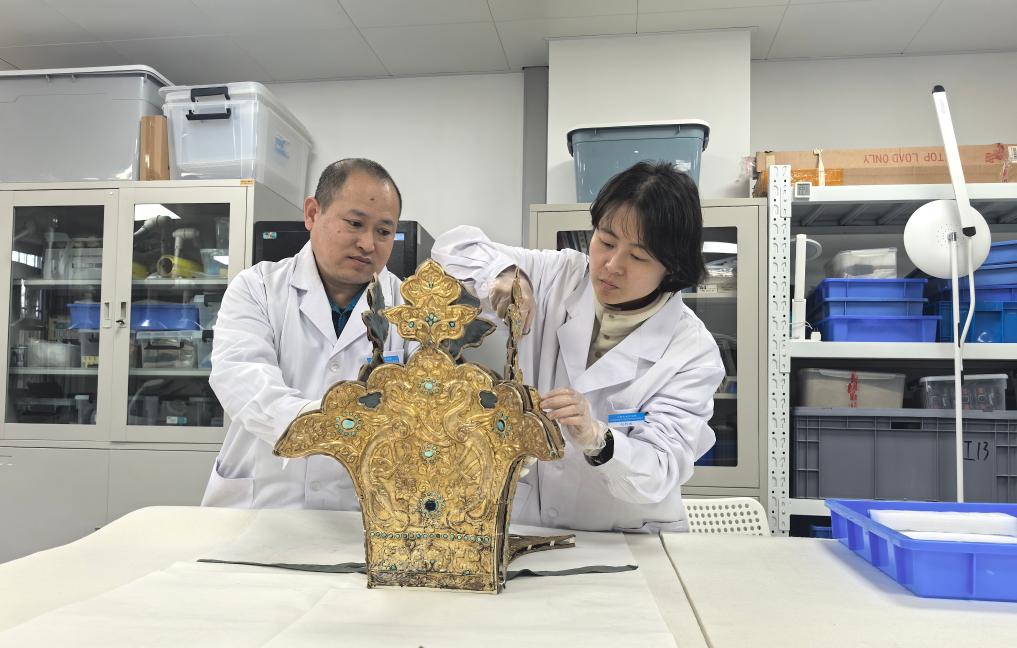 王冠的主体厚度不到200微米,几乎是3张A4纸叠加的厚度,构成冕旒的2400多颗宝石散落如沙……专家介绍,面对青藏高原盐碱侵蚀下“骨质疏松”的金属文物,修复团队创新性地使用激光焊接技术修复,金冠片整体焊接了上万个点。