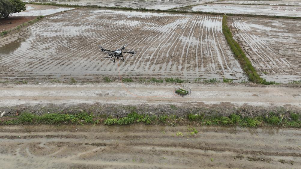这是4月1日在福建南安拍摄的无人机吊运物资的画面(无人机照片)。新华社记者 周义 摄