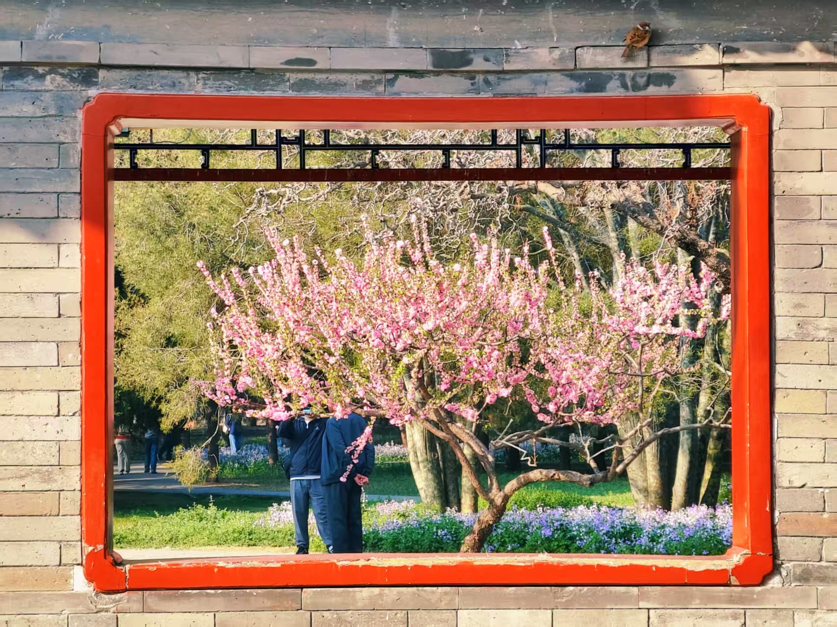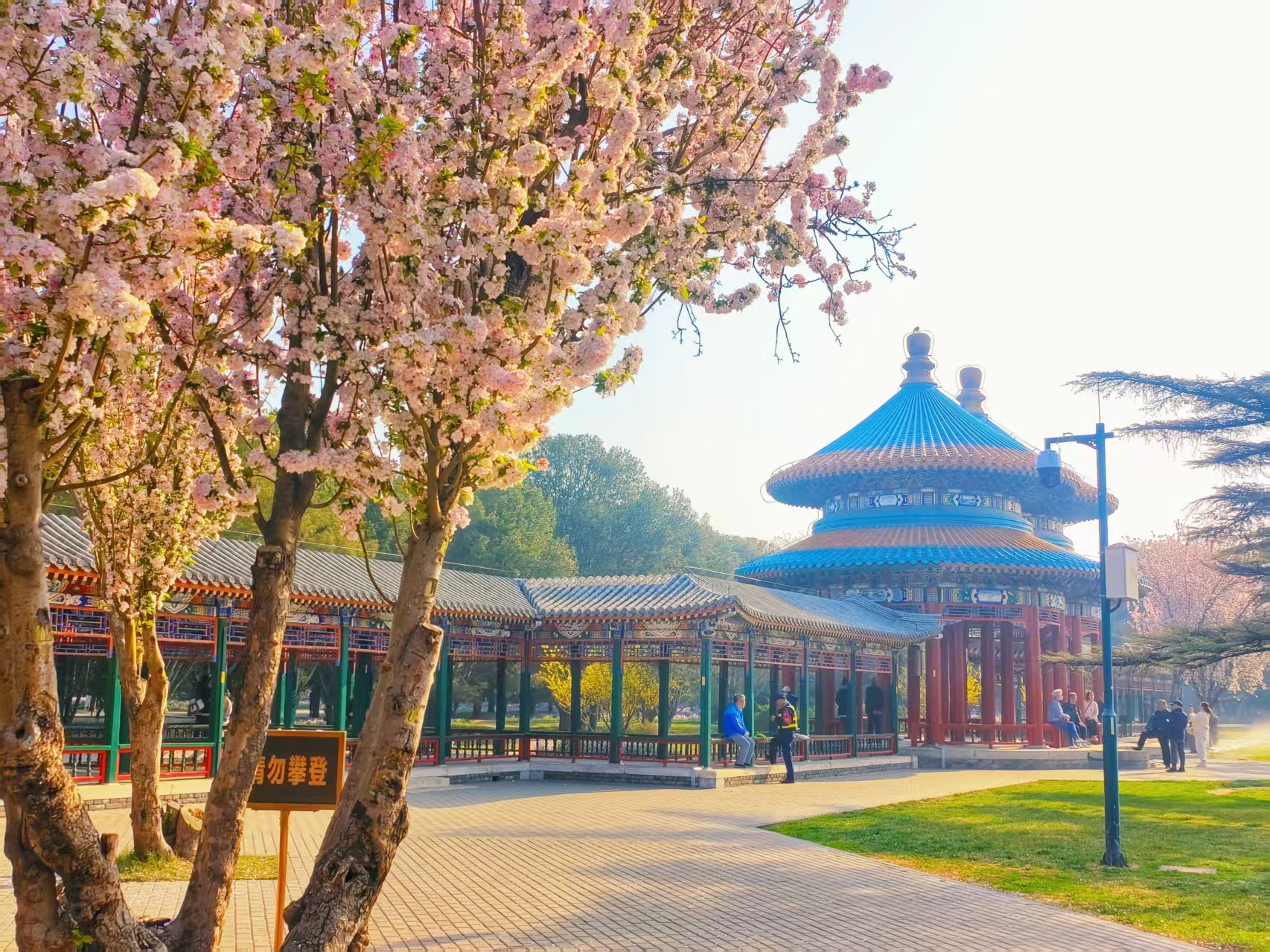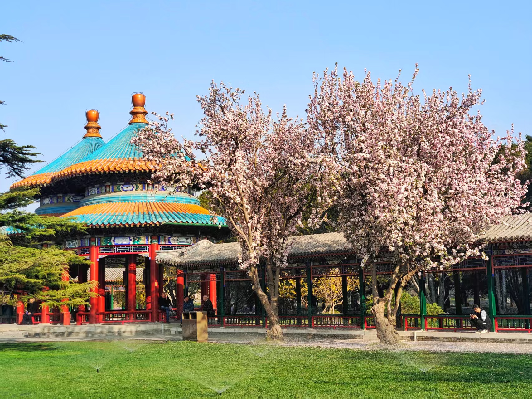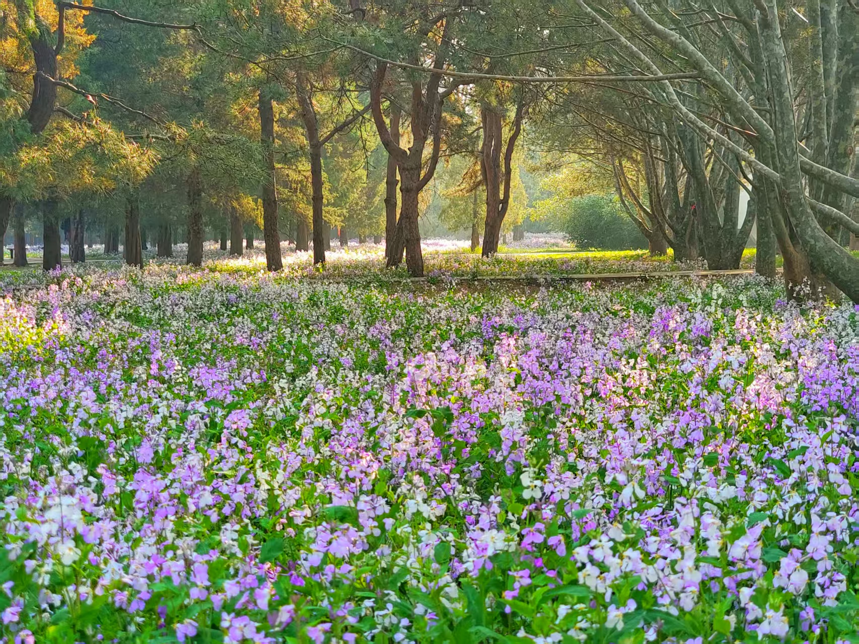天坛公园古老的杜梨树鲜花怒放,二月兰如梦幻花毯,海棠与连翘竞相媲美。