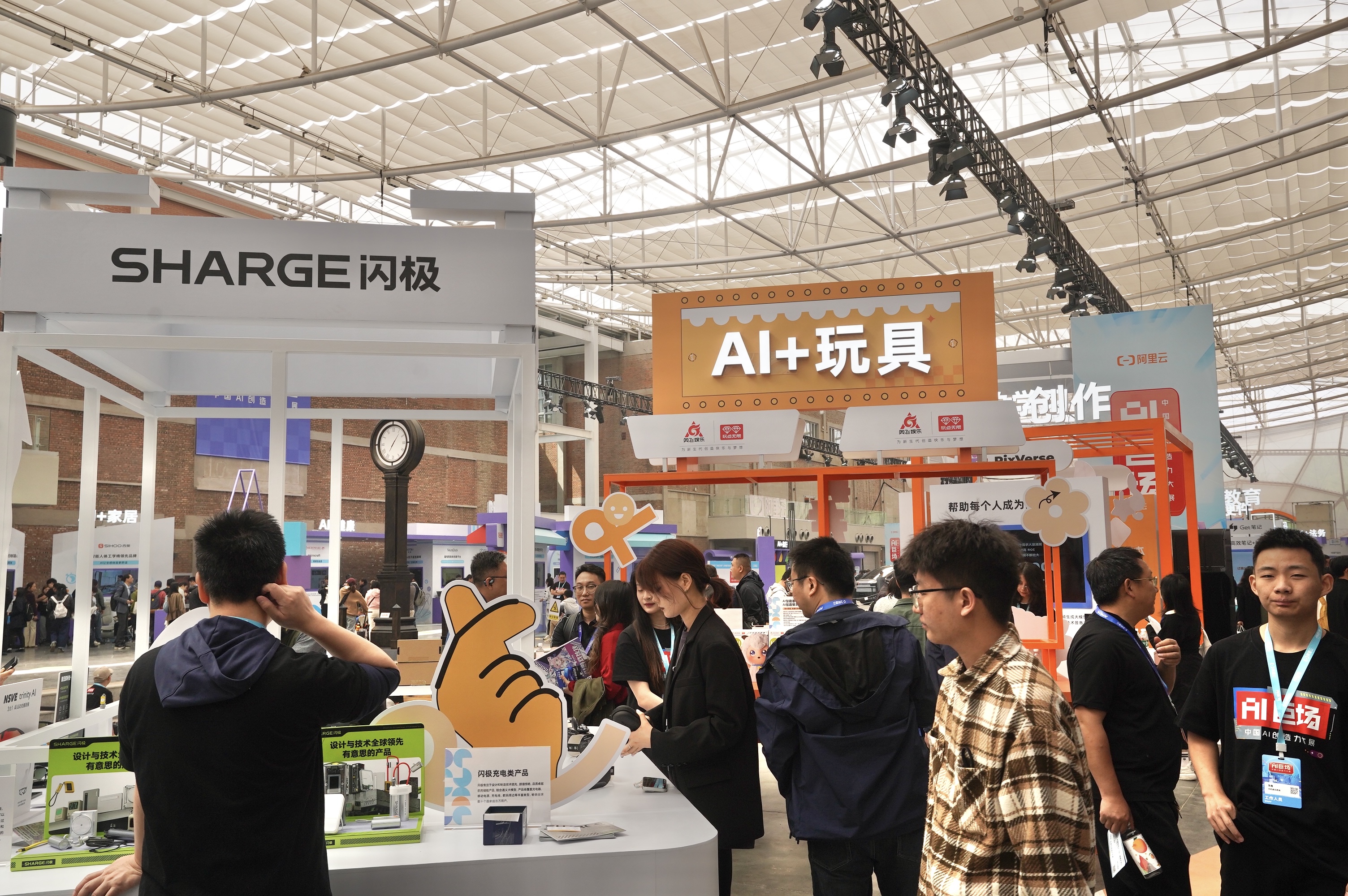 展区共分为机器人、娱乐、生活、生产力、学习等五大板块,吸引了宇树科技、加速进化、伟景智能、小鹏汇天、闲鱼、B站、奥飞娱乐、爱诗科技、昆仑万维等百余家企业参展,将为大众带来陆地飞车、AI眼镜、AI玩具、AI扫地机器人、AI宠物等丰富展品,以及AI家教、AI法务、AI写剧本、AI写代码、AI音乐编曲、AI记笔记等各类智能服务体验。活动现场还有和机器人现场组队踢足球、AI剧场小舞台SHOW、搭乘“AI创造力快线”收集“灵感值”赢礼品等多元互动内容。