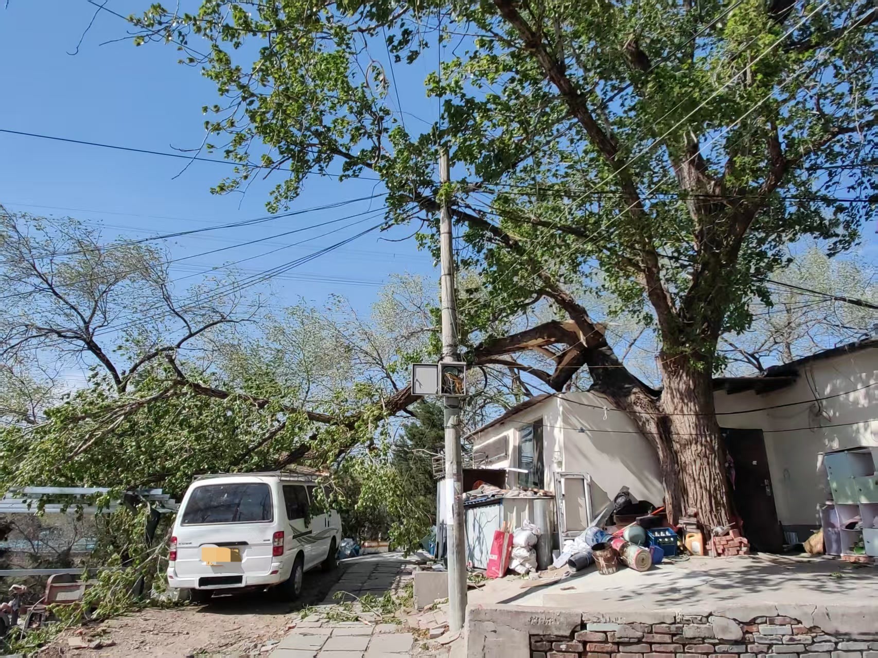 当天早7点,城建四卫生院平房区的一户房屋旁,直径约60至70厘米的树枝被大风吹折。城建四物业巡查发现此情况后,立即上报给了边府社区,社区立刻联系苹果园街道安排应急队伍赴现场处置。