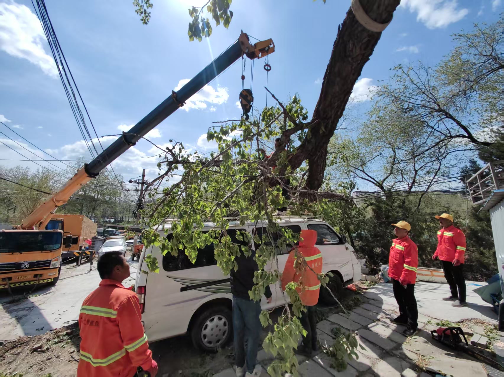 倒折树木既压到了居民车辆又压到电线,为现场处置带来困难。边府社区现场联系车主,协助车主确定损失并推动挪车。应急抢险队伍调派吊车和抢险队员,立即对倒伏树枝进行砍伐、修剪,并清理现场残枝。