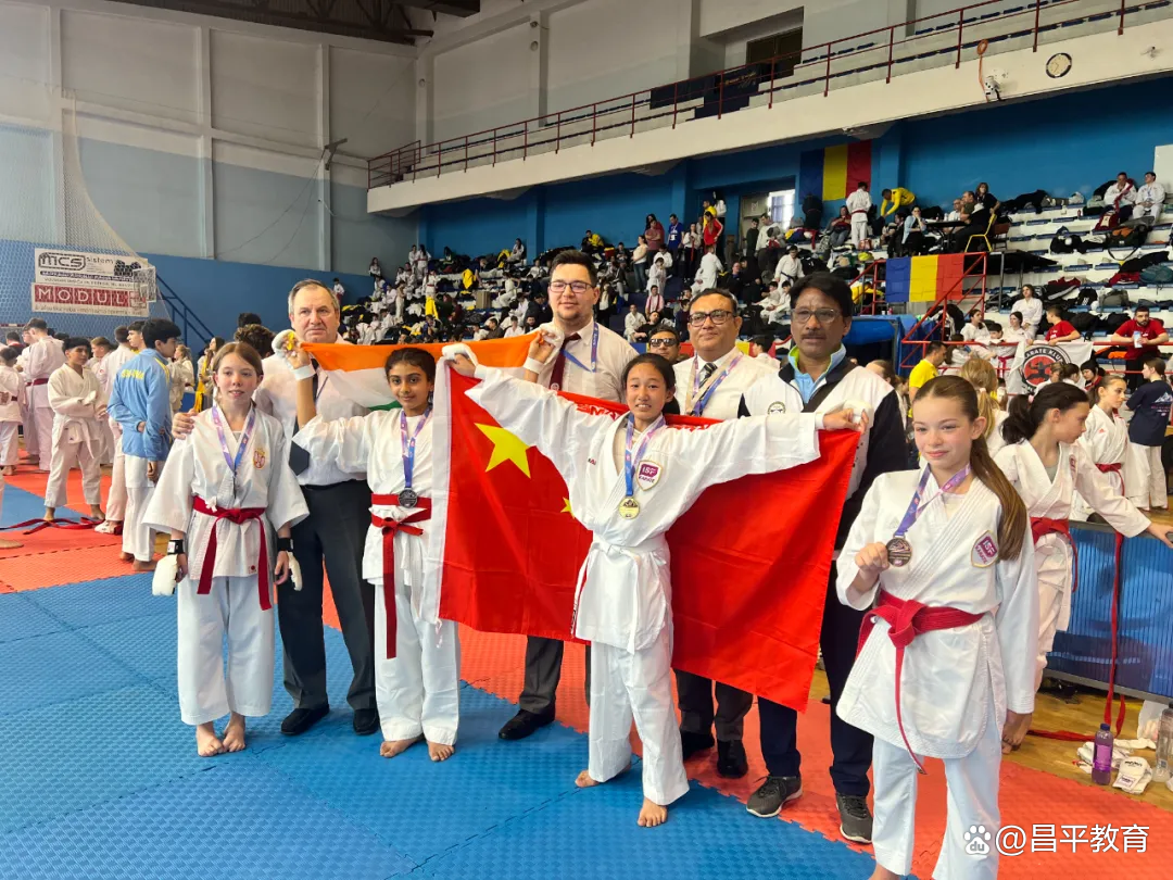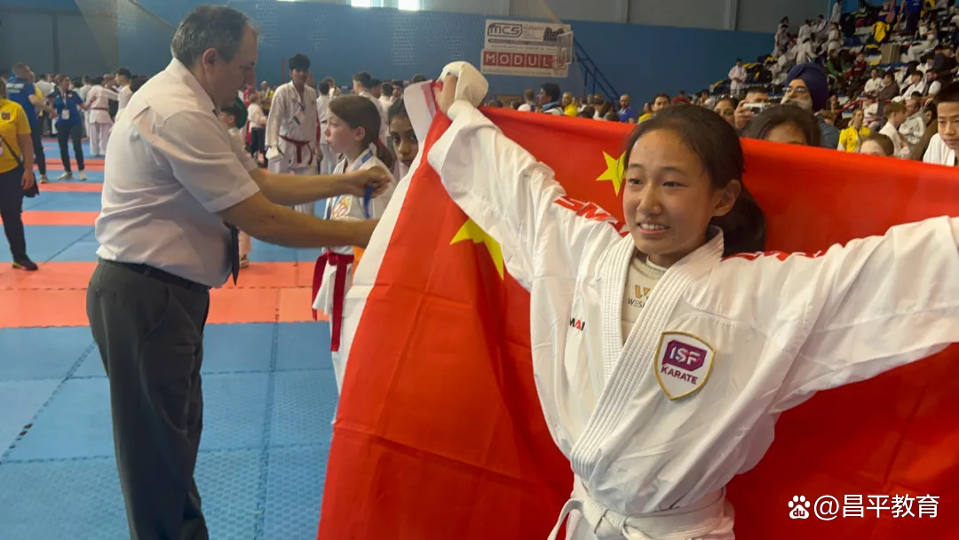 塞尔维亚当地时间4月11日,在2025年U15世界中学生夏季运动会中,来自北京市昌平区第五学校小学部的刘雨鑫同学先后战胜罗马尼亚、塞尔维亚、印度等国家的31名选手,获得空手道女子一本组手-43kg第一名,为中国中学生体育代表团再添1金!在随后的空手道女子个人三本组手-43kg级比赛中,为中国中学生空手道体育代表团斩获第三金,再创佳绩!