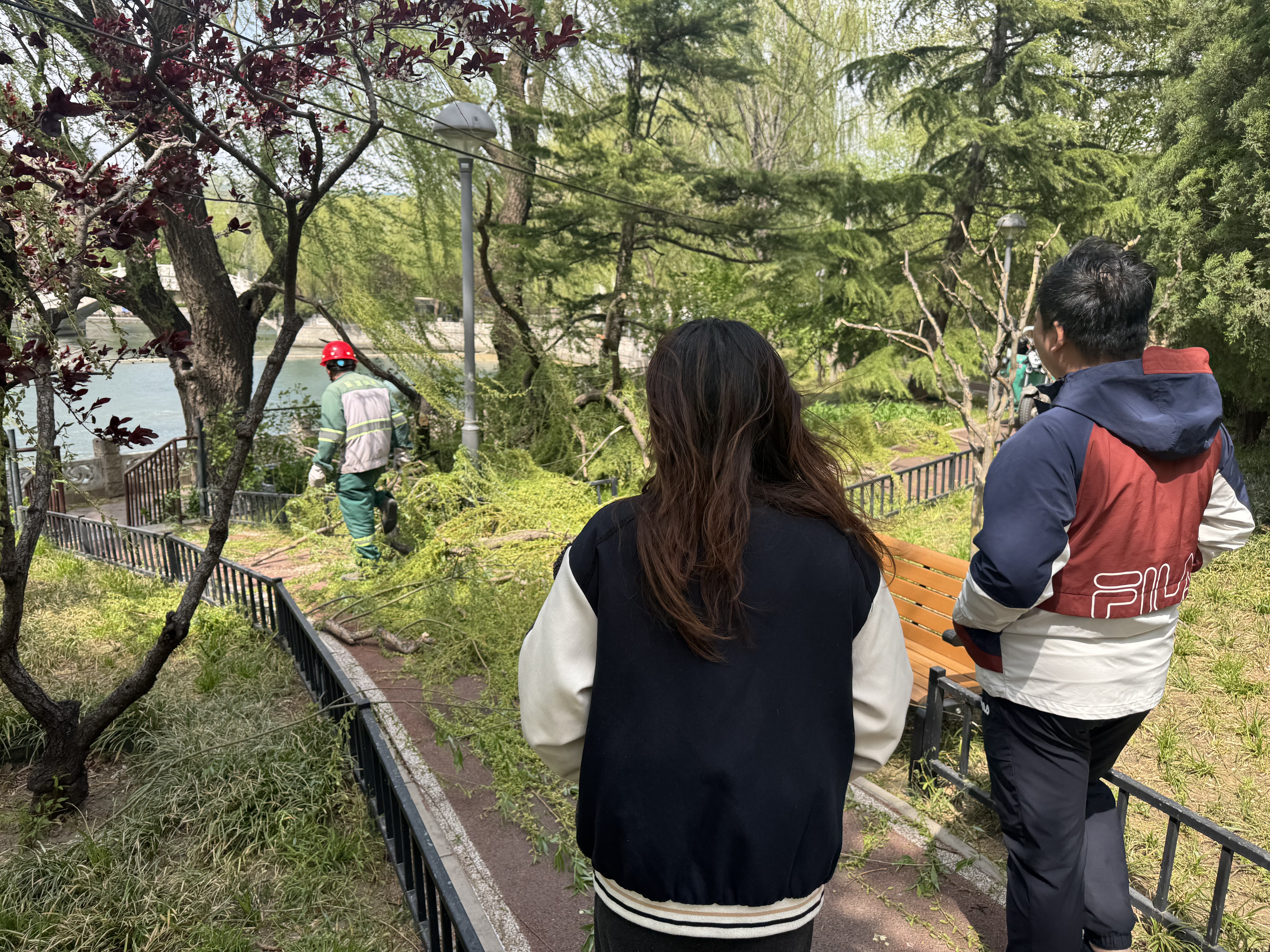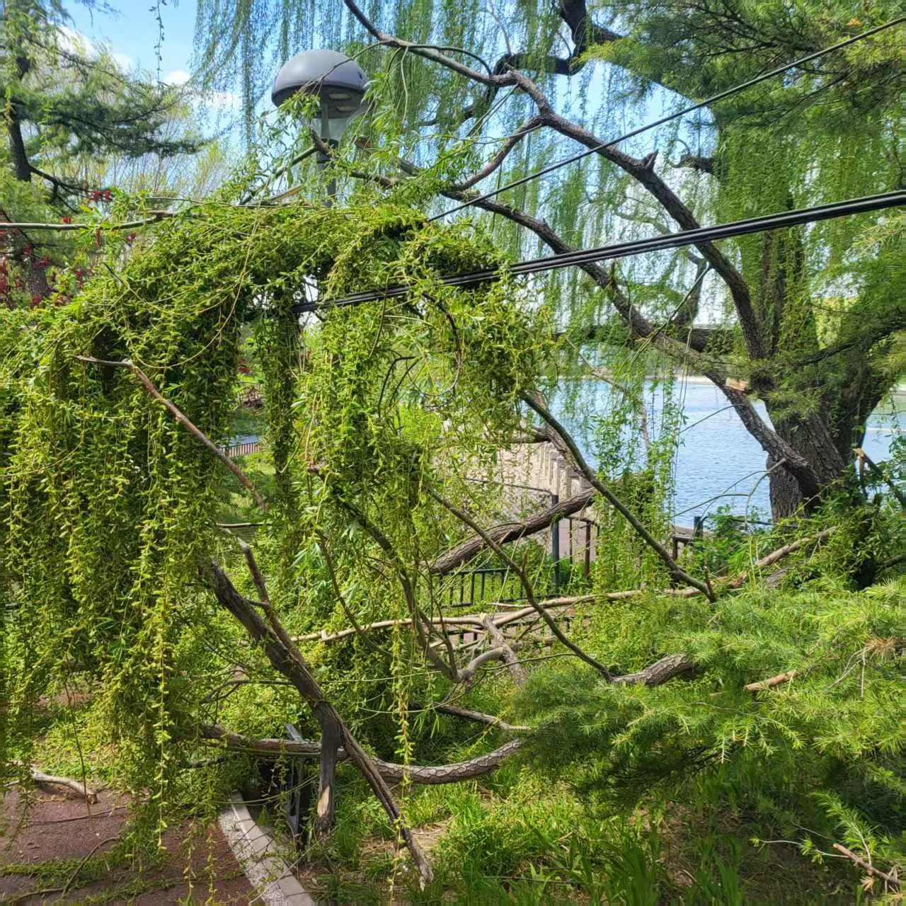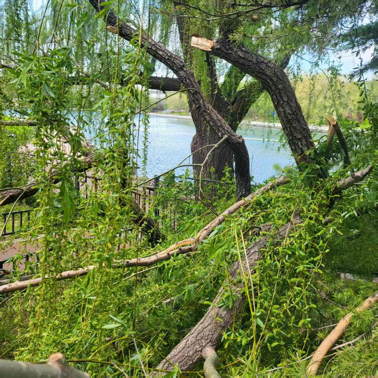 事发后,社区工作人员迅速启动应急响应机制,第一时间将险情上报展览路街道城管科及西城区园林绿化应急抢险队。现场立即设置警戒线,并安排专人疏导过往居民。倒伏柳树横亘人行步道,部分枝干已触及照明线缆及公园护栏,存在较大安全隐患。