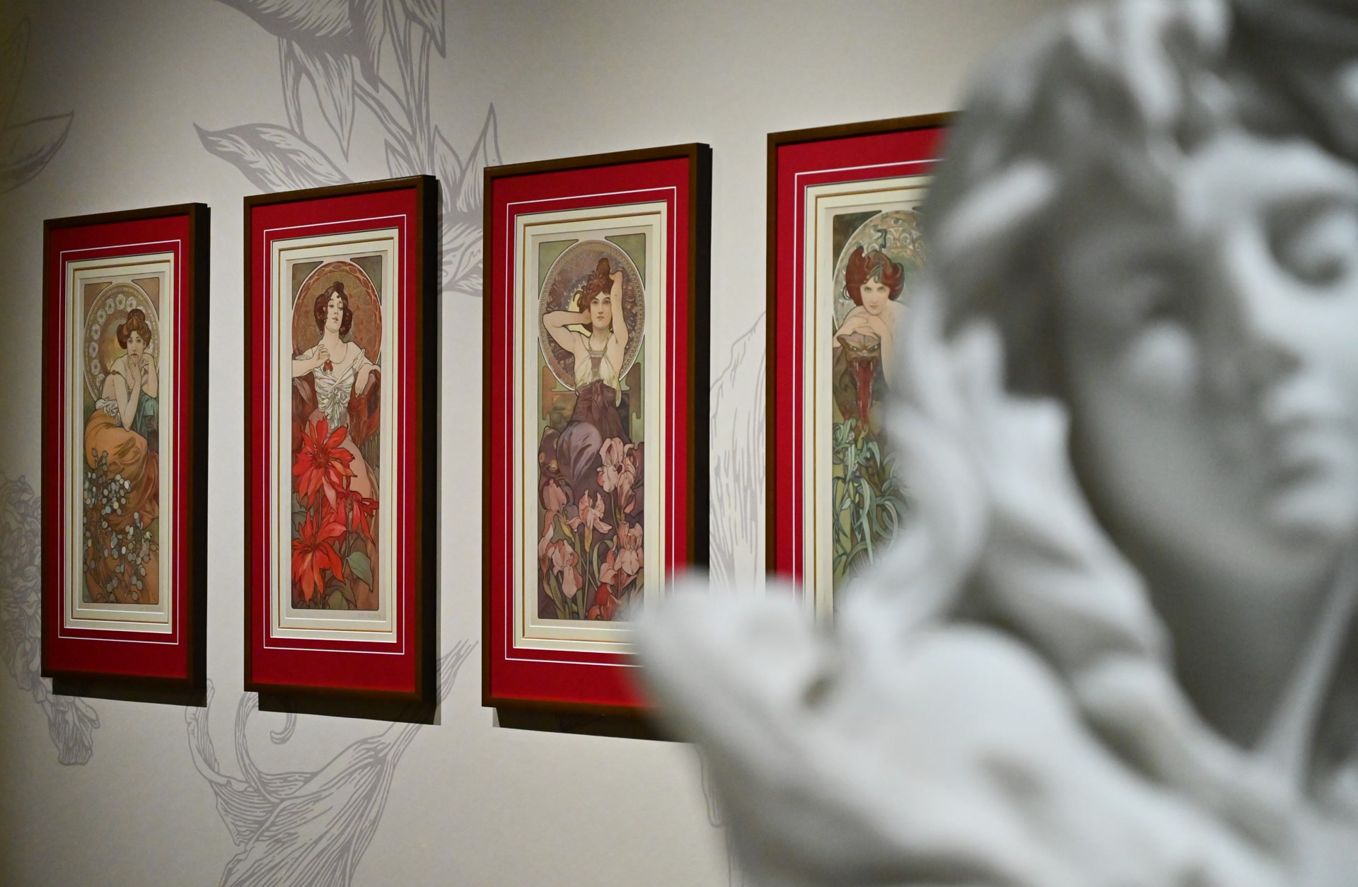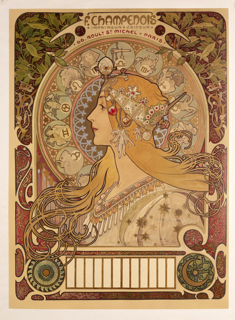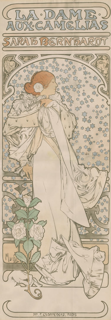 1894年,穆夏在巴黎为新年戏剧《吉斯蒙达》设计海报,以其独特的风格轰动巴黎。19世纪兴起的妇女解放运动浪潮,女性题材成为绘画作品的热门主题。穆夏为画中的女性人物勾勒梦幻的造型,穿上华美的服饰,创造出无数个优雅迷人、气质独特的女性形象。这种以女性身姿为画面主体,运用优美的曲线,明快和谐的色彩,融合了传统拜占庭、巴洛克及洛可可艺术和东方浮世绘的视觉设计被称为“穆夏风格”。本次展览展出了穆夏创作的诸多商业海报作品,包括其戏剧海报艺术成就最高的《茶花女》等一系列经典海报,这一时期最经典的《四季系列》等多组穆夏经典两联幅、四联幅作品。