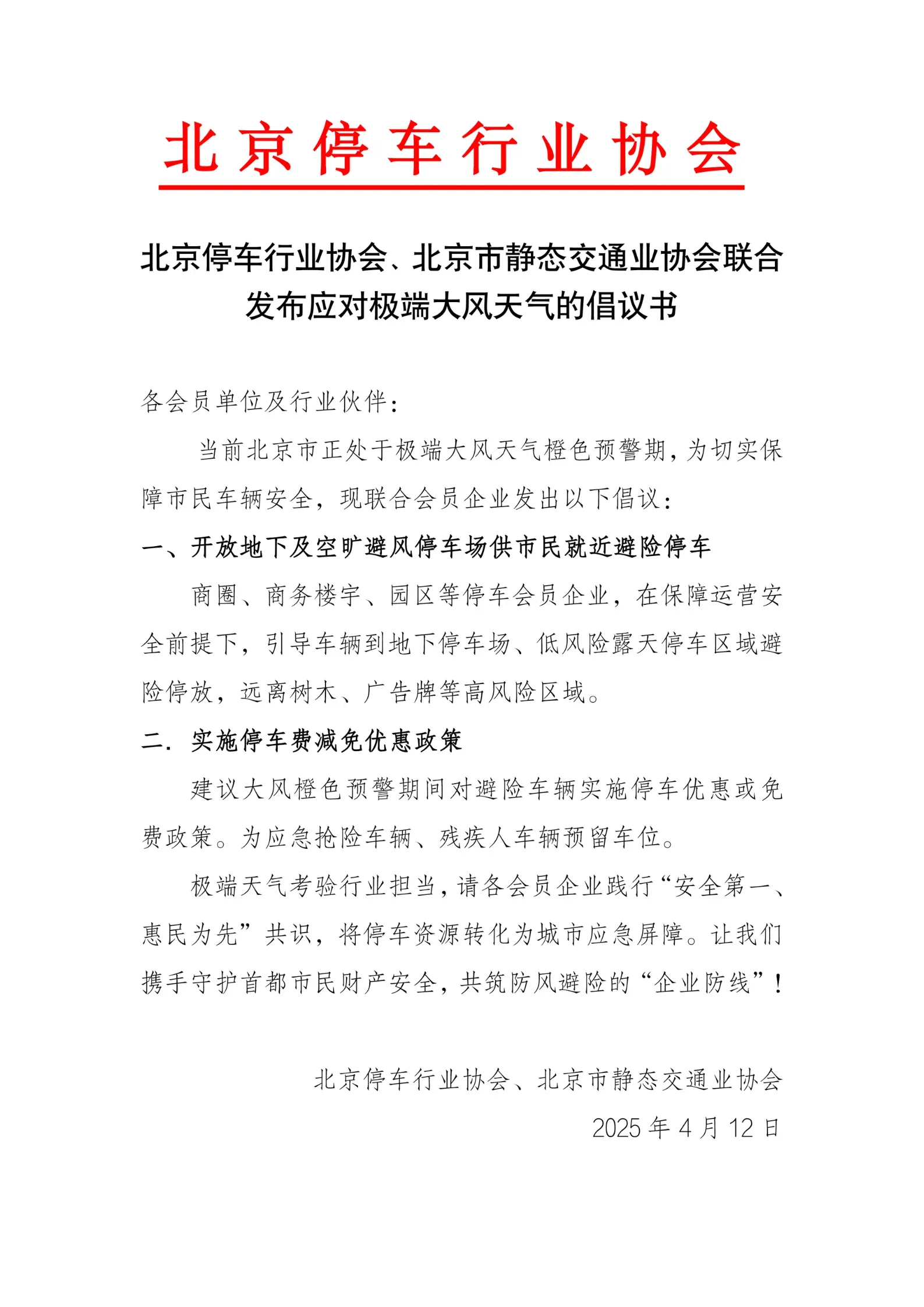 北京朝阳区发布倡议,鼓励全区各街乡统筹利用空间资源,开放共享停车位,延长服务时间,扩大服务内容。北京市交通委联合北京停车行业协会、北京市静态交通业协会发出倡议,希望有条件的商圈、商务楼宇、园区在保障运营安全前提下,引导车辆到地下停车场、低风险露天停车区域避险停放。建议大风橙色预警期间,对避险车辆实施停车优惠或免费政策,并为应急抢险车辆、残疾人车辆预留车位,最大程度保障市民财产安全。