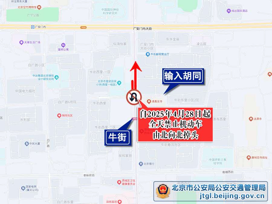 为保障道路交通安全顺畅,根据道路交通安全法律法规有关规定,决定自2025年4月28日起,西城区牛街与输入胡同交叉口全天禁止机动车由北向北掉头。