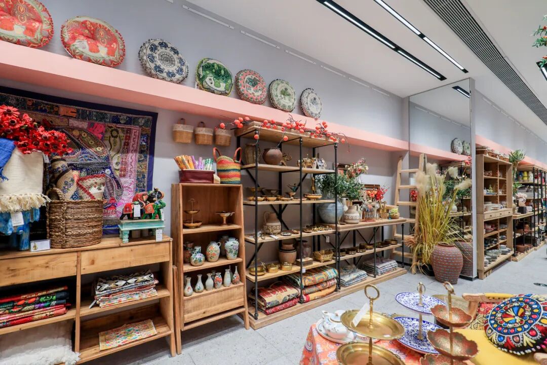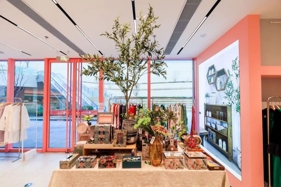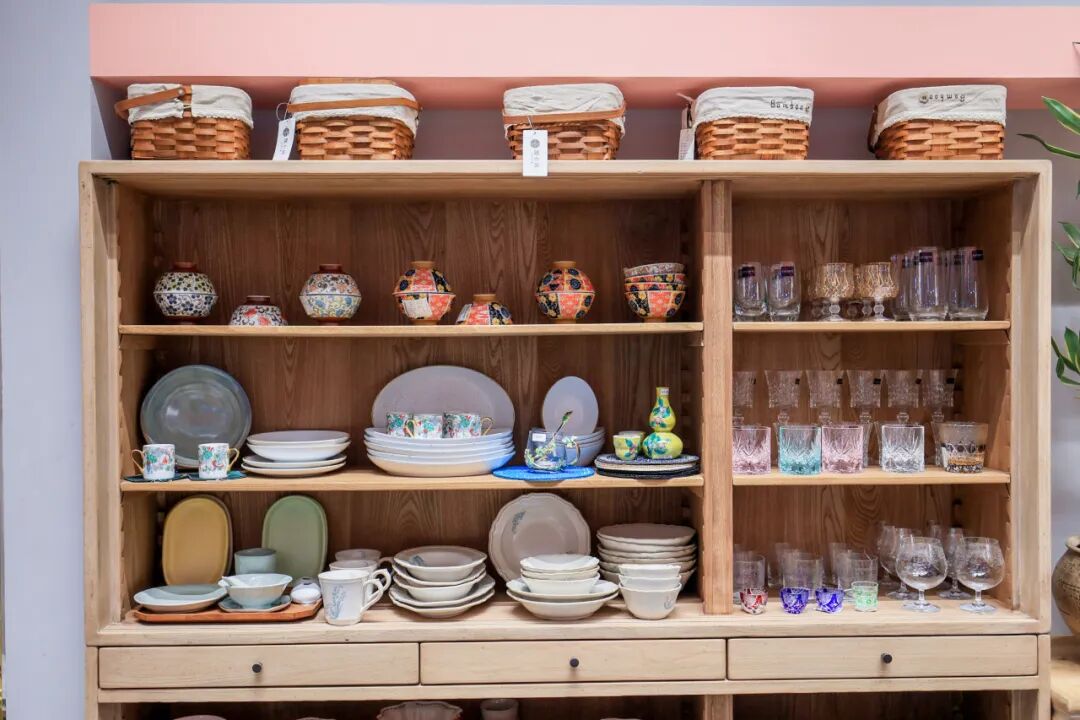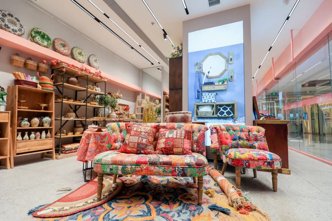 不同区域按照不同主题陈列,比如复古床品区,木质餐具区等,店铺中间是一幕民族风的客厅场景,仿佛下一秒就会有人端来一杯咖啡坐下。