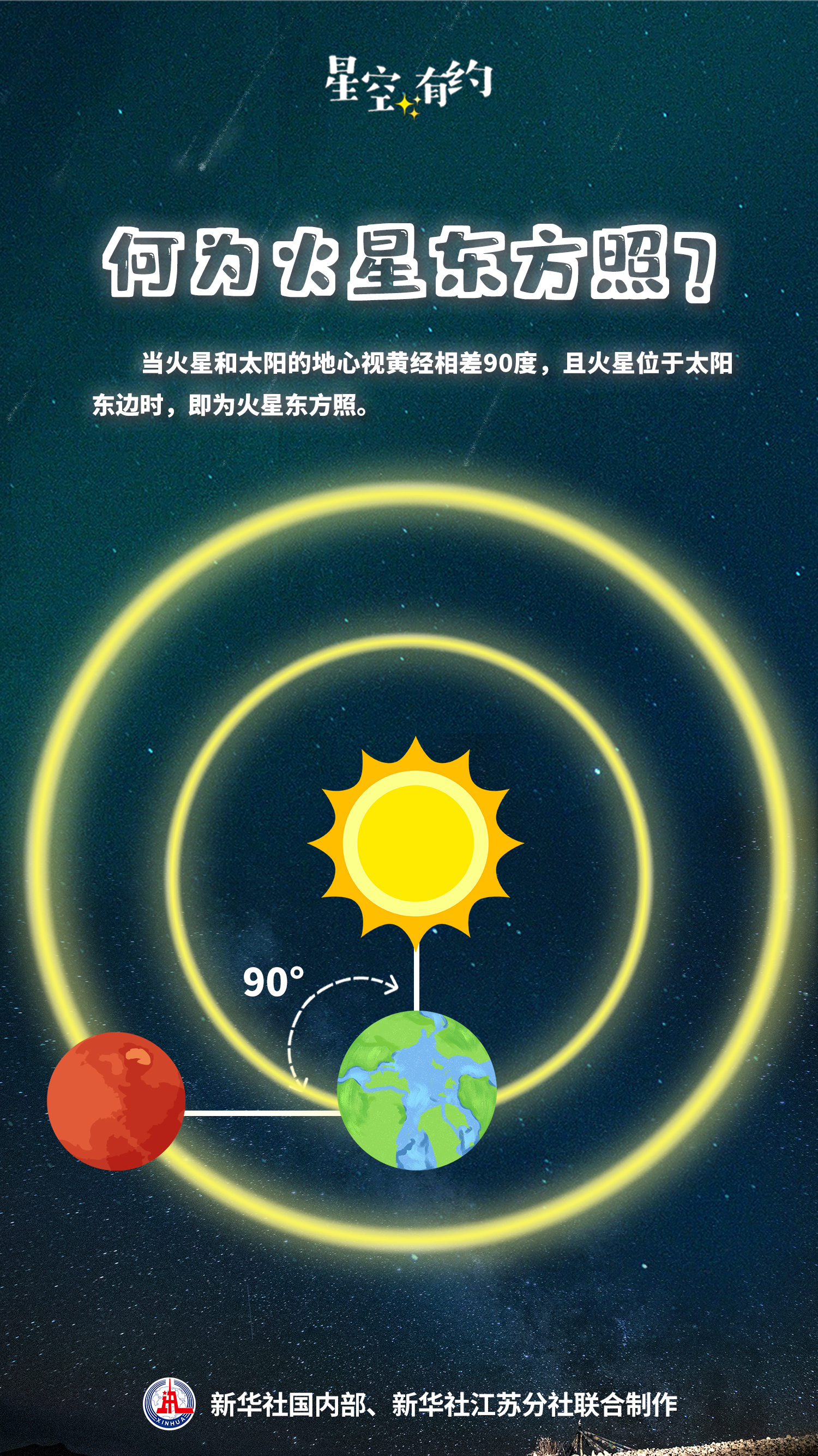 中国科学院紫金山天文台科普主管王科超介绍,当火星和太阳的地心视黄经相差90度,且火星位于太阳东边时,即为火星东方照。“如果俯视太阳系的平面,此时会看到太阳、地球、火星形成了一个直角,地球处于直角的顶点。”