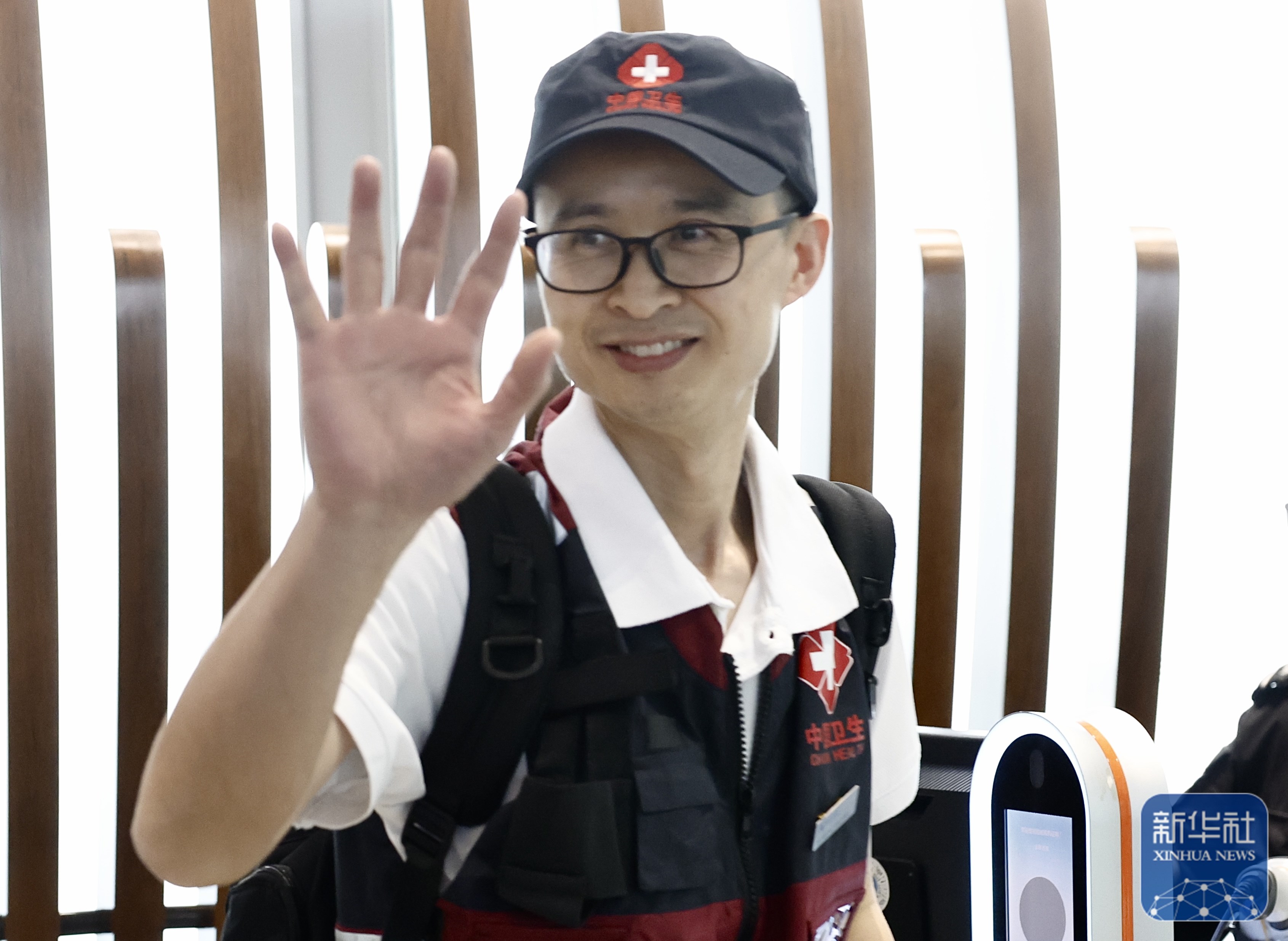 ↑ 4月19日,一名从北京出发的队员在北京首都机场向送别的亲友挥手。新华社记者 张玉薇 摄