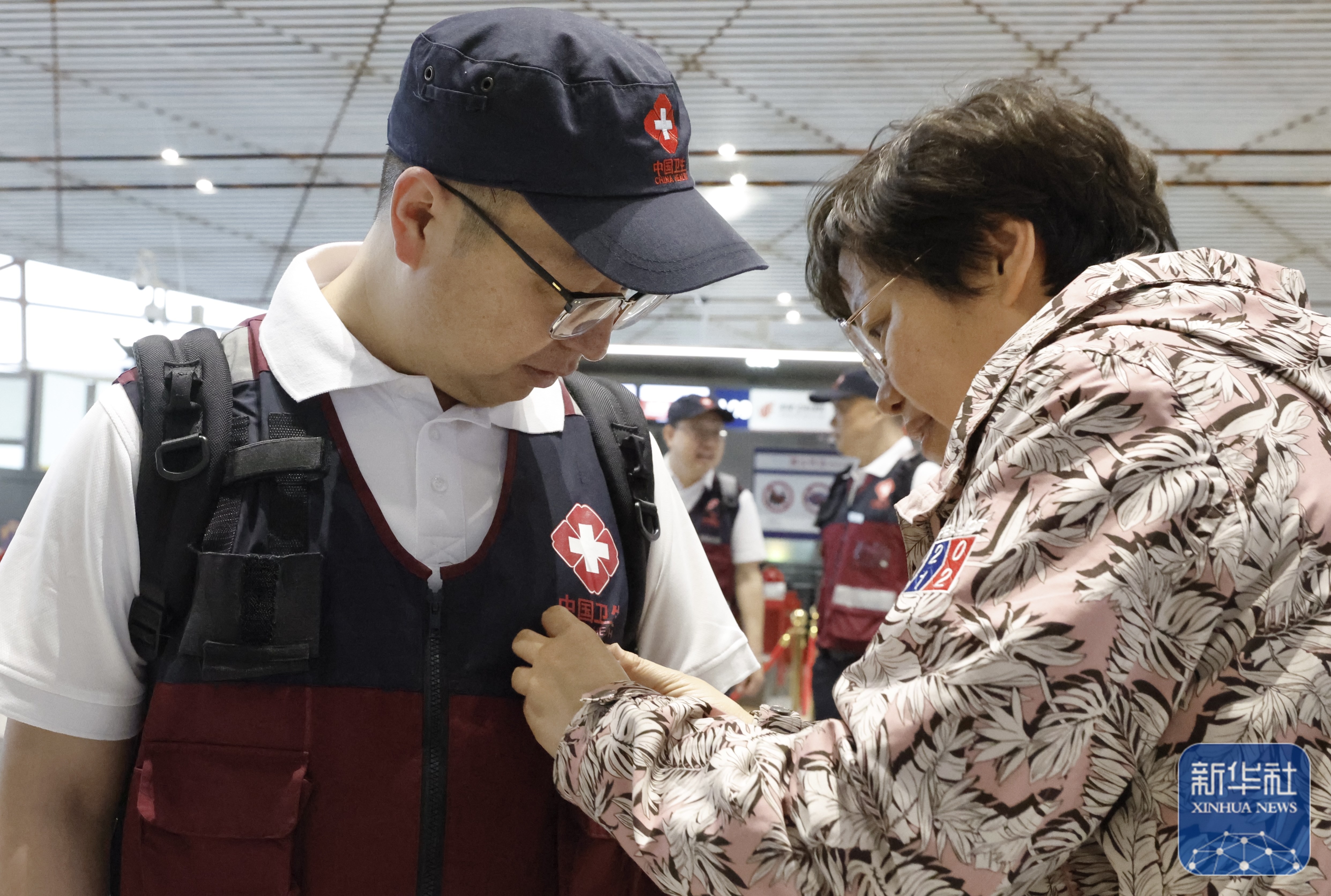 ↑ 4月19日,家属为一名从北京出发的队员在北京首都机场整理行装。新华社记者 张玉薇 摄