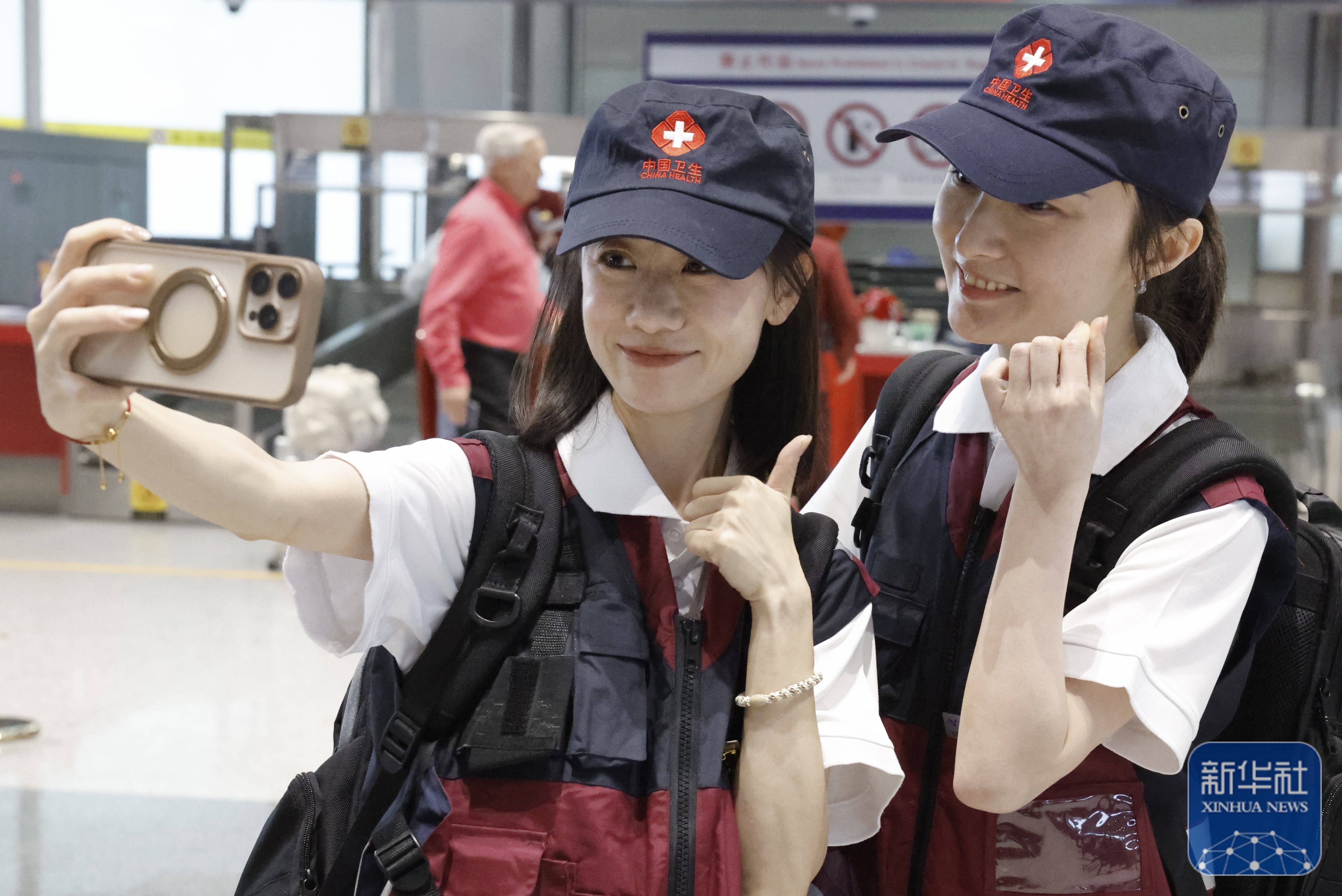 ↑ 4月19日,两名从北京出发的队员在北京首都机场自拍留念。新华社记者 张玉薇 摄