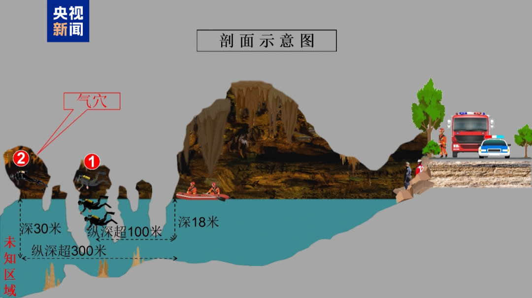 广西百色市公安局巡警支队副支队长梁良:洞穴潜水是造成潜水员死亡最多的,洞穴潜水救援是极限救援里面的“珠峰”。所谓的黄金七十二小时其实是不适用的,气体一耗尽,你就马上溺亡了。