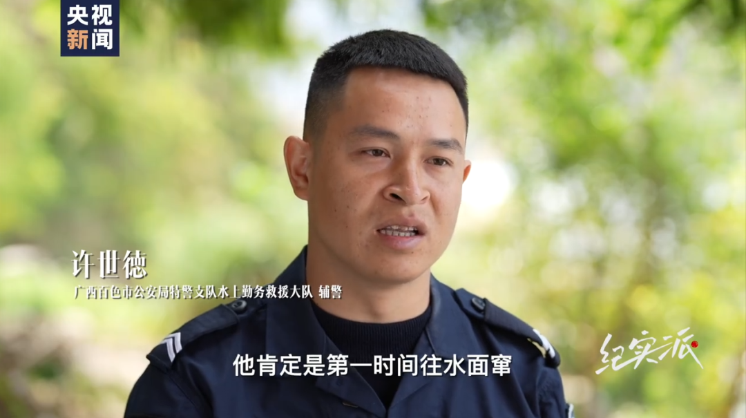 广西百色市公安局特警支队水上勤务救援大队辅警许世德:根据我们这么多年的经验来讲,一个恐慌的潜水员他肯定是第一时间往水面窜。所以说我们第一时间重点就是排除气室(有没有人)。