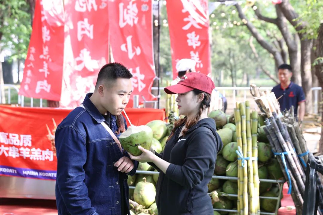 逛累了,那就来特色美食区享受一场舌尖上的盛宴。烤串、鸡蛋仔、清补凉、椰子、新疆特产等美食应有尽有,香气四溢,让人垂涎欲滴。市民游客们坐在树影下,一边品尝着美食,一边与三五好友谈天说地,享受着惬意的午后时光。游客陈先生一边吃着烤串,一边笑着说:“这里的美食很丰富,味道也很棒,逛市集的同时还能大饱口福,真是太满足了。”