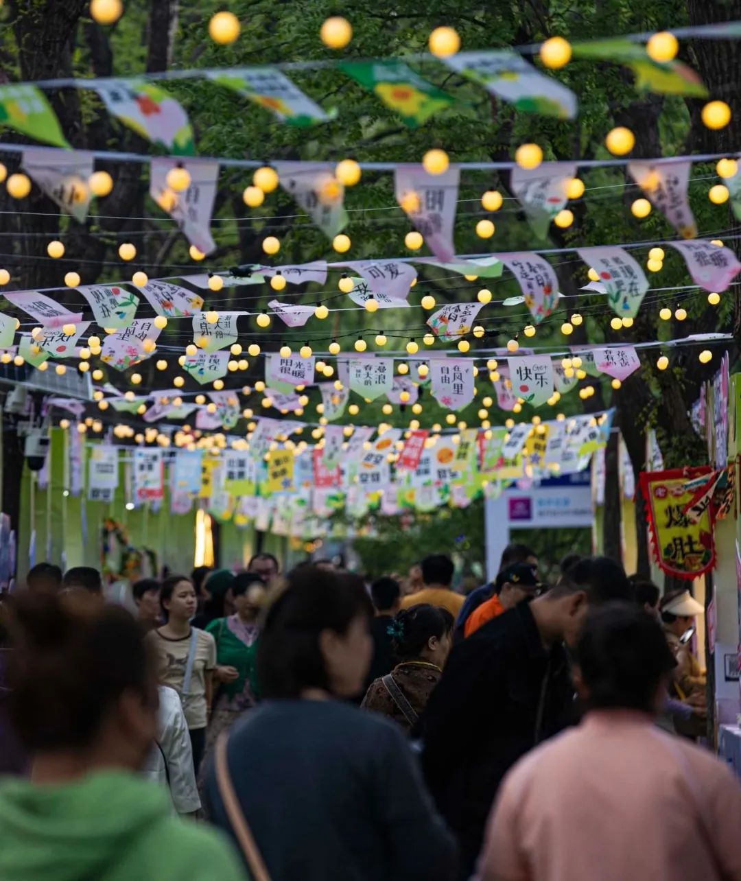 △泡桐花市集里灯光亮起,游客们在四处游览。张磊/摄