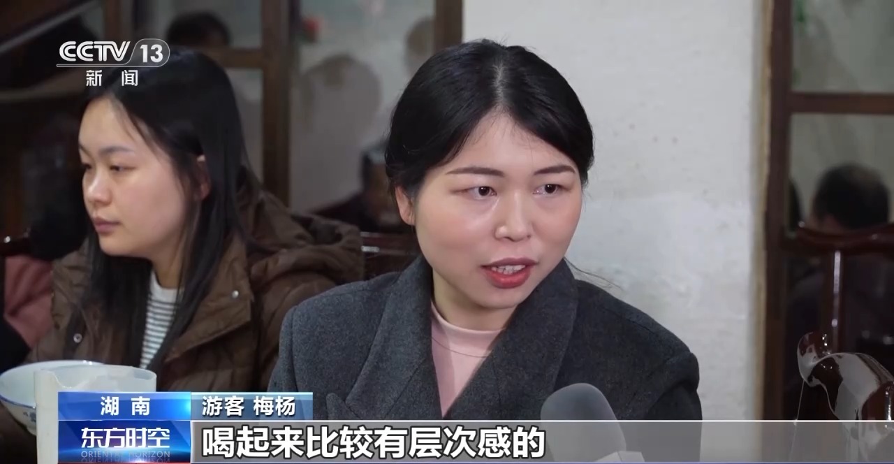 游客 梅杨:我们常德的擂茶是喝起来比较有层次感的,我经常和我的同事、朋友约出来一起喝擂茶,可以更好增强彼此之间的感情。