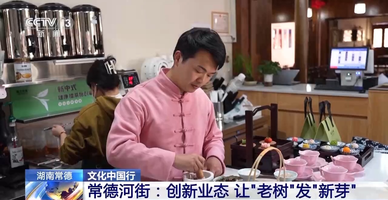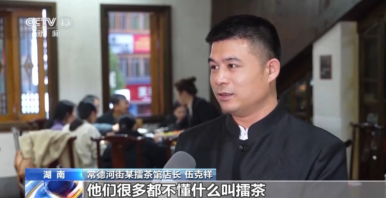常德河街某擂茶馆店长 伍克祥:擂茶就是我们店里的特色,我们这里有可以在桌子上用碗喝的,也有外面一杯一杯带走的,生意最火爆的时候一天可以卖到一千多碗,接近两千碗。很多外地的游客,包括国外的都有,他们很多都不懂什么叫擂茶,我就给他们介绍,上了一桌他们体验之后,顾客觉得很新颖,很好。