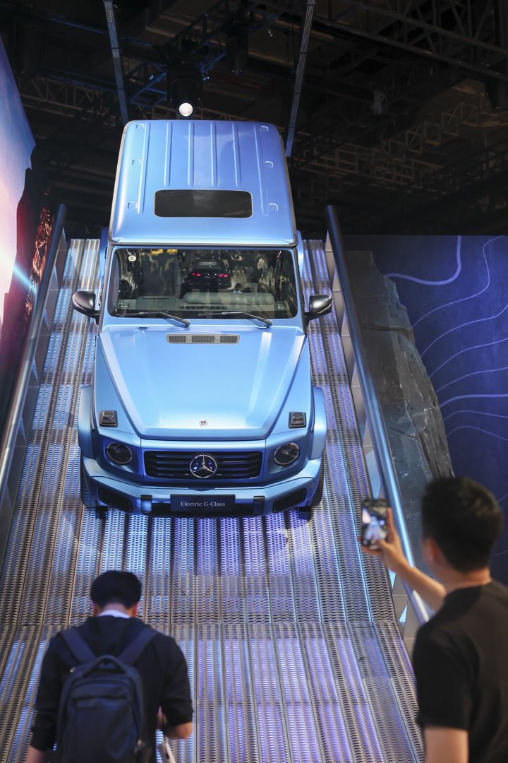 图为4月23日,观众在上海车展奔驰汽车前拍照。 新华社记者 王 翔摄