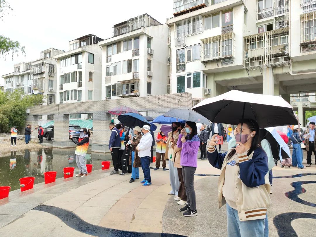 在金鱼池社区广场,居民参与金鱼放生活动。