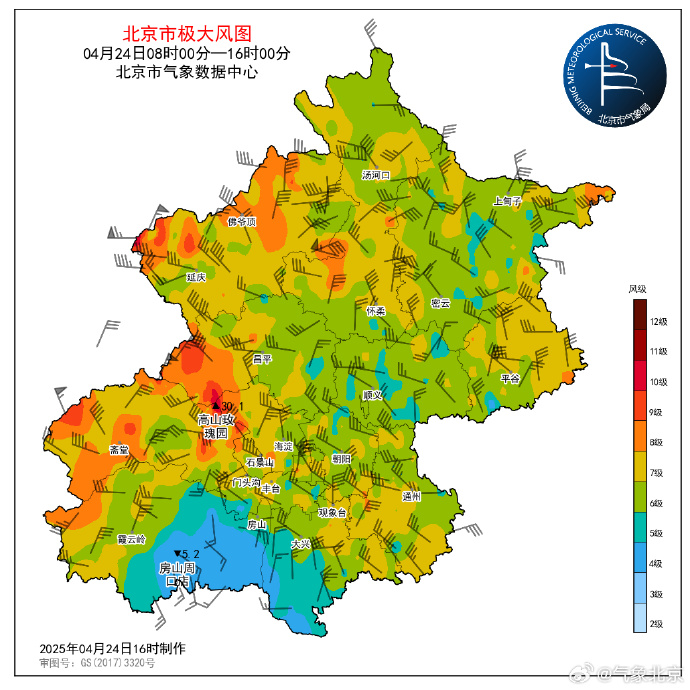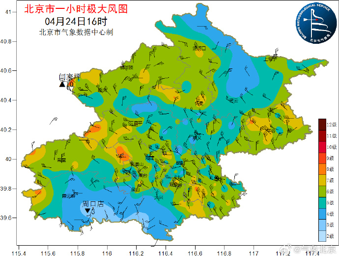 今天白天北京出现大风天气,有3、4级偏北风,阵风6、7级,局地8级以上。8时至16时,全市最大阵风风速出现在门头沟高山玫瑰园,为30.1米/秒(11级);平原地区最大阵风风速出现在海淀凤凰岭,为19.2米/秒(8级)。