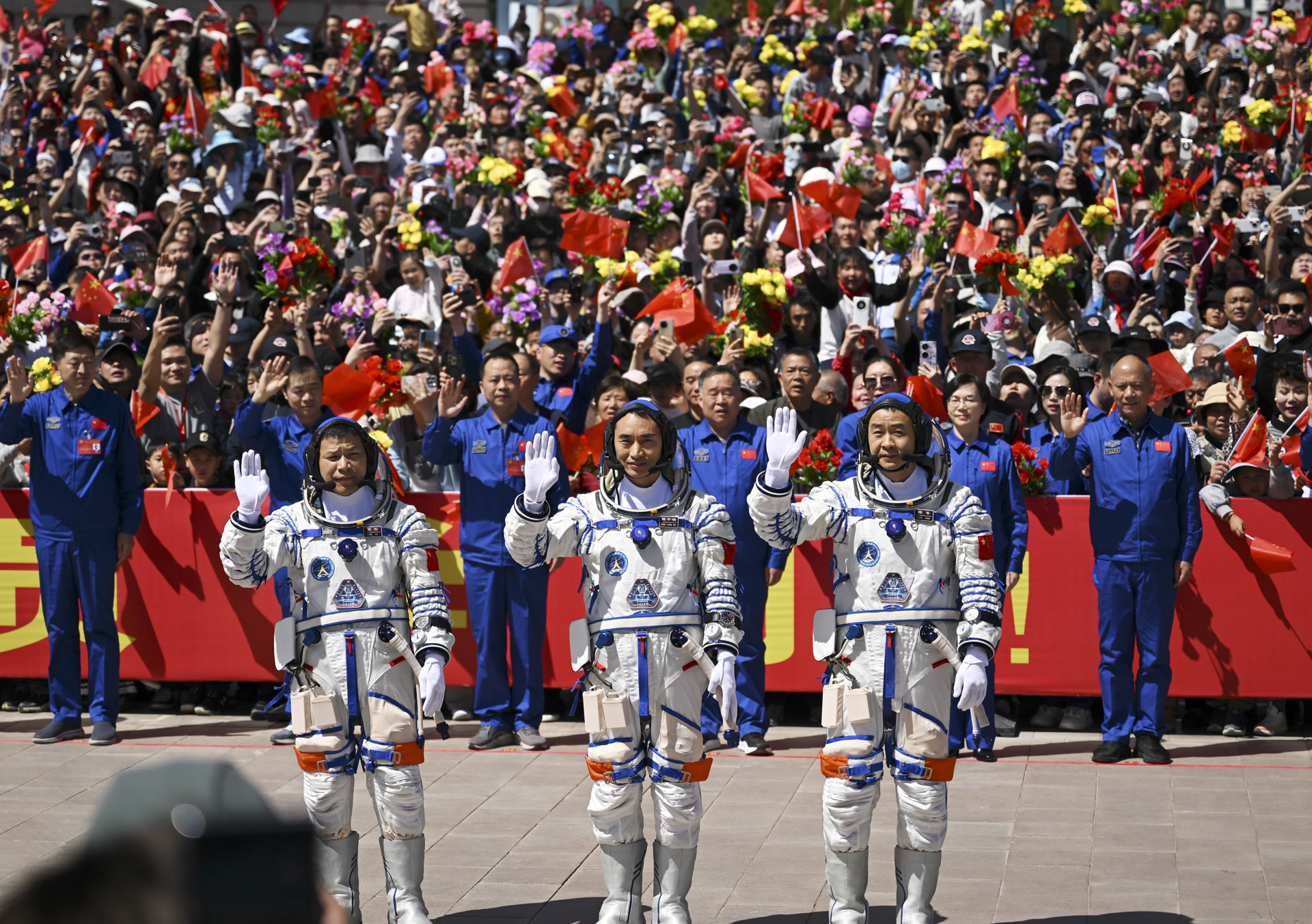 戈壁滩的正午,烈日灼灼,14时许,问天阁前的圆梦园广场上人头攒动。在掌声、欢呼声的簇拥下,航天员陈冬、陈中瑞、王杰领命出征。伴随着《歌唱祖国》的旋律,他们向欢送队伍挥手致意,登车前往发射场。