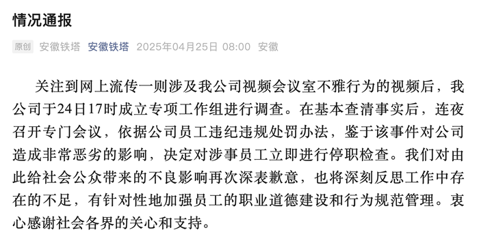 4月25日,中国铁塔股份有限公司安徽省分公司发布情况通报: