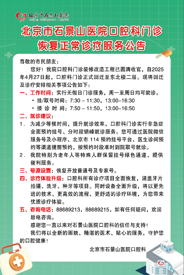 石景山医院口腔科门诊恢复正常诊疗服务公告