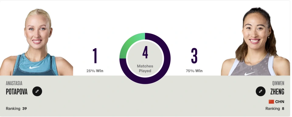 郑钦文和波塔波娃此前有过4次交锋,均在硬地,郑钦文3胜1负占据优势,最近一次是2024年迪拜站直落两盘轻松获胜。但其余三场均陷入鏖战,四场共计9盘比赛出现5次“抢七”。