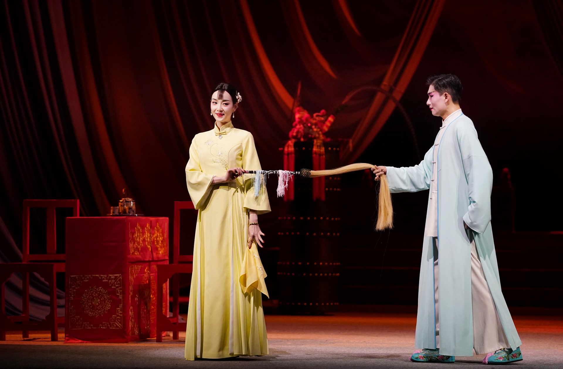 1957年,《风雪夜归人》由夏淳执导,张瞳、杨薇、童弟、舒绣文等表演艺术家共同出演,在北京人艺的舞台上打造了首版经典。68年后,《风雪夜归人》用更加轻盈的姿态走近当代观众。传统戏曲的神韵深度浸润话剧舞台,在表演上,无论是魏莲生的特邀演员、来自北方昆曲剧院的武生刘恒,还是陆璐、李洪涛、梁国栋、刘宸等一众人艺演员,都借鉴戏曲韵味展开人物层次。刘恒与饰演玉春的陆璐表现尤其突出,除了大量长绸舞、跑圆场等戏曲要素,两人的几次情感递进都以更加抽象的、糅合了浓郁戏曲风格的肢体动作予以衬托,拂尘轻扫,执手相望,两人的相识、倾心、分离循序渐进,尾声处,一段情感饱满的双人舞更是把他们相思相望不相亲的遗憾推向高峰。