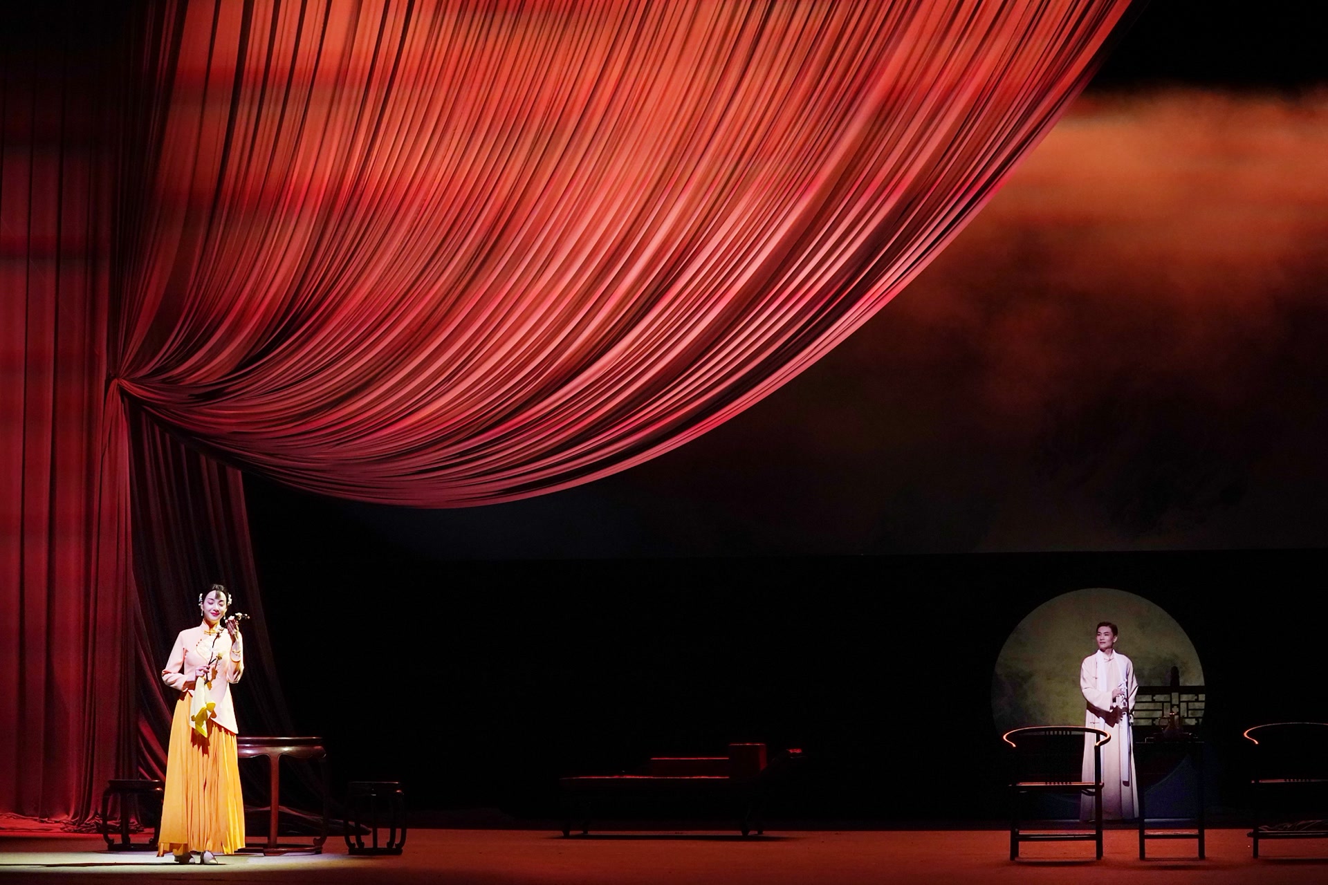 在舞台设计上,不同于人艺作品惯常的厚重之感,《风雪夜归人》以举重若轻的大写意风格贯穿全场。主创团队化用传统戏曲的“守旧”(即底幕、堂幕等舞台装置),布设了层叠深邃的幕布,“软景”的大量运用成为一大亮点,剧中重要场景魏莲生的家几乎全部由幕布搭成。同时,戏曲舞台上常用的“一桌二椅”作为主要道具,与随剧情流动的朦胧幔帐、斜倚花枝、门院矮墙相映衬,简洁地组成院落、戏台、书房等场景,再加上光影的精细雕琢,不同时空的转换流畅轻巧,颇有典型的东方式诗意之美。