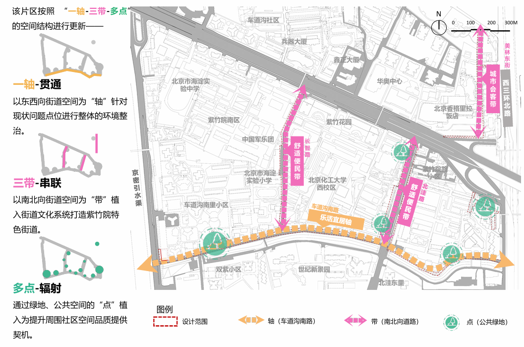 记者了解到,本次更新项目以东西向街道空间为“轴”,针对现状问题点位进行整体的环境整治;以南北向街道空间为“带”植入街道文化系统,打造以城市会客带、舒适便民带为主的紫竹院特色街道;通过绿地、公共空间的“点”,为提升周围社区空间品质提供契机。提升后的车道沟片区将成为环境优美、功能完善的城市更新样板,彰显海淀区城市魅力,最终形成“一轴-三带-多点”的空间结构。