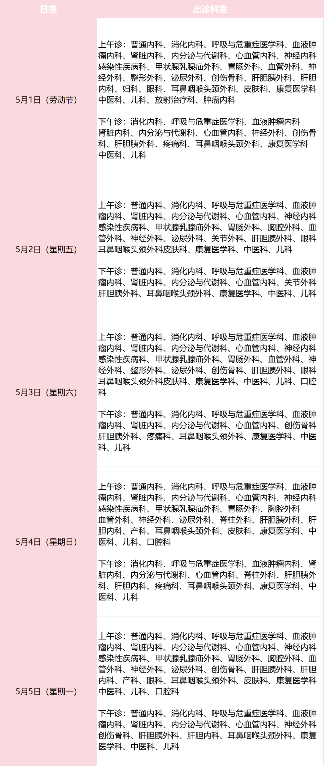5月1日至5月5日:安排半日门诊,部分专家出诊。