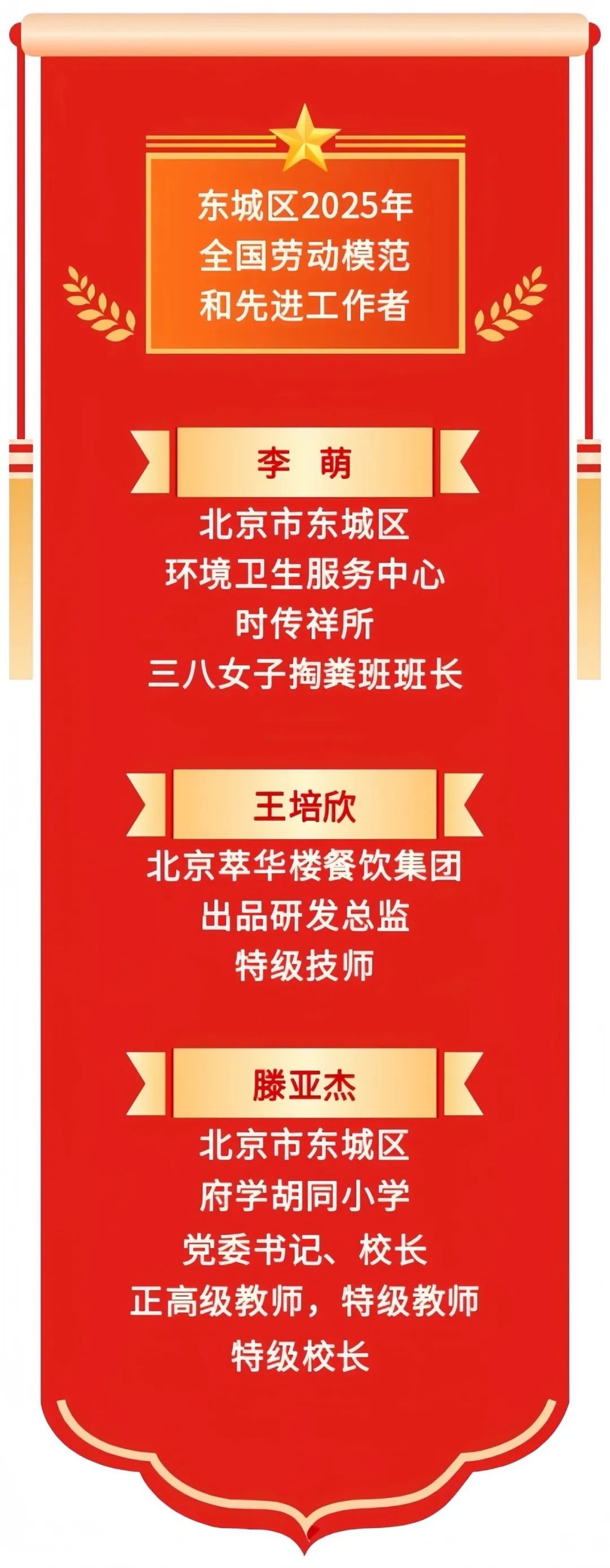 荣光因劳动而闪耀,幸福由奋斗来书写。今年是五年一次的全国劳动模范和先进工作者表彰年,是我国第17次评选表彰全国劳动模范和先进工作者。东城区高度重视全国劳动模范和先进工作者的推荐评选工作,按照规定程序,坚持公开、公平、公正原则,充分发扬民主,广泛接受社会监督,经层层遴选,东城区环境卫生服务中心时传祥所三八女子抽粪班班长李萌,北京萃华楼餐饮集团出品研发总监、特级技师王培欣,府学胡同小学党委书记、校长、正高级教师、特级教师、特级校长滕亚杰三人荣获全国表彰。