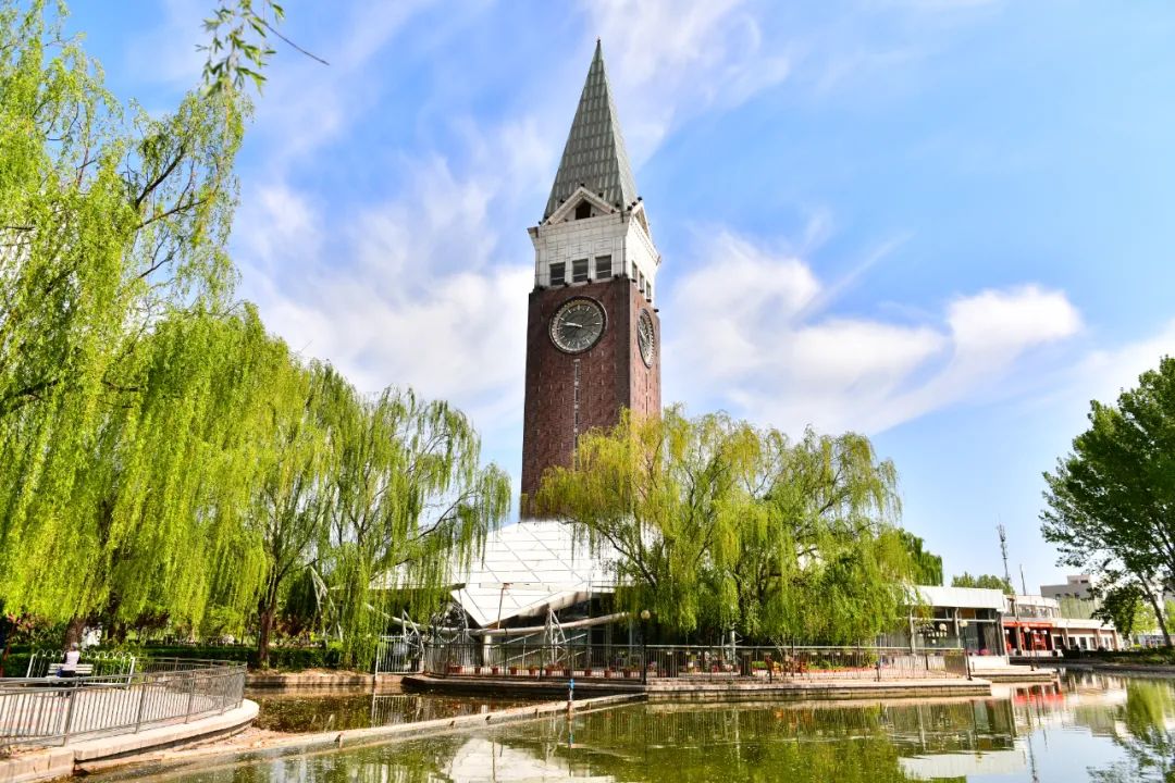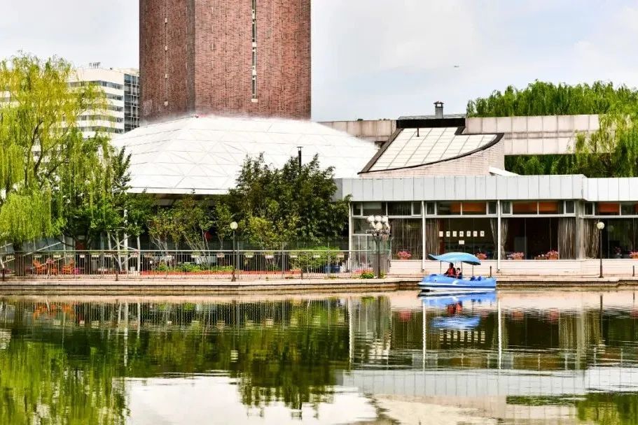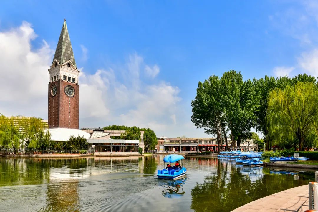 湛蓝天空下,高耸的千禧塔倒映在水面,小船畅游湖中,惬意美好,好一幅灵动的水上游园画卷。