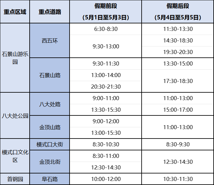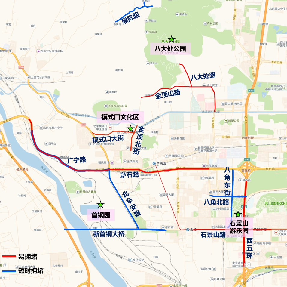 ◾节假日期间,预计从上午9:00起,首钢园、八大处公园、石景山游乐园、模式口文化区等地区周边道路车流量将有所增加。