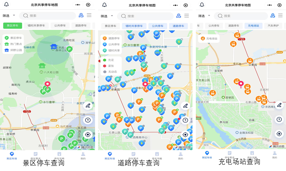 北京市停车场信息可通过“北京静态交通共享停车”小程序查询,可分类查询景区停车、道路停车、充电场站等信息,选定停车场后,一键导航出发。