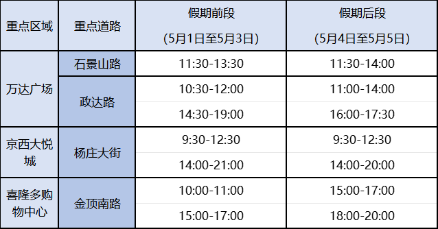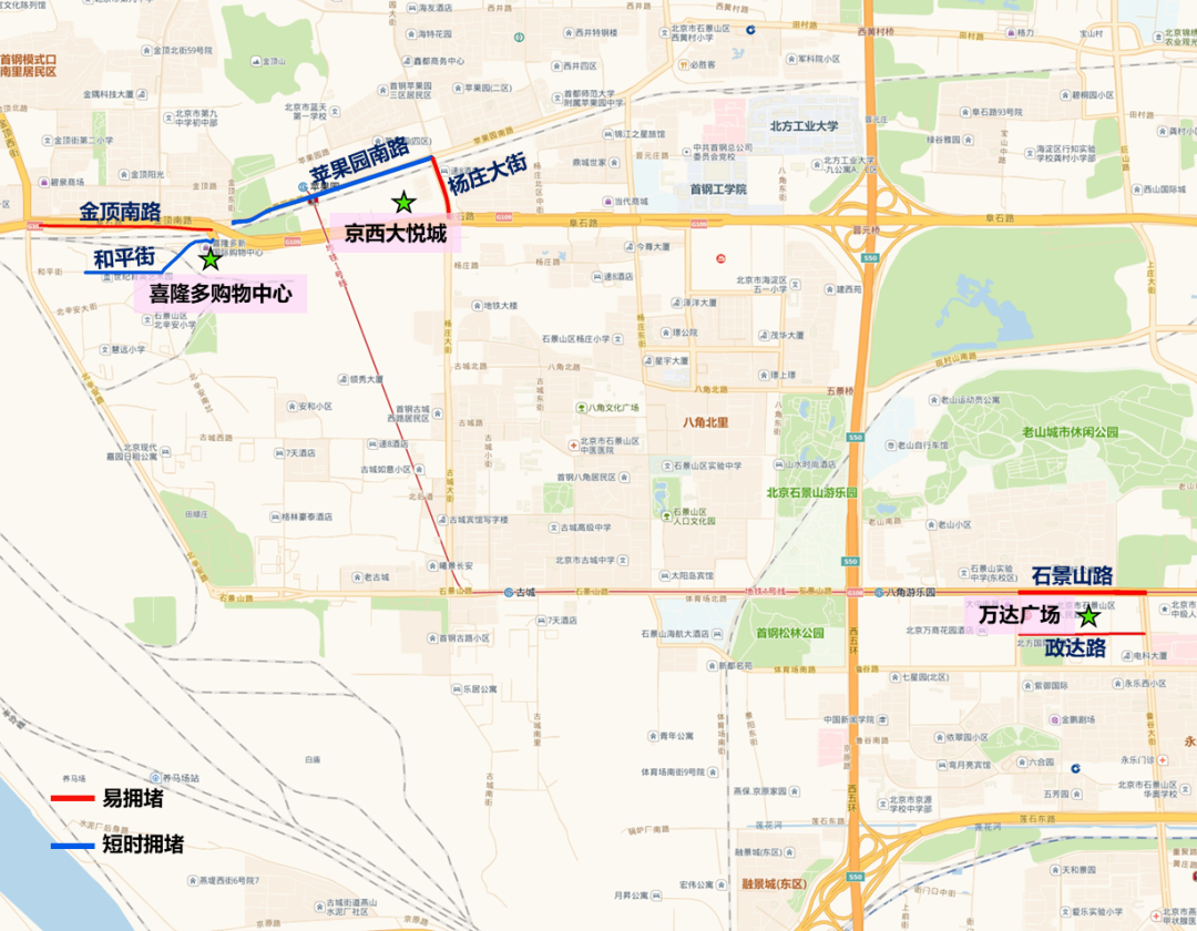 商圈周边道路上午11:00-13:00,以及下午15:00-18:00是出行高峰。万达广场周边的石景山路、政达路,京西大悦城周边的杨庄大街,喜隆多购物中心周边的金顶南路部分时段可能出现行车缓慢情况。