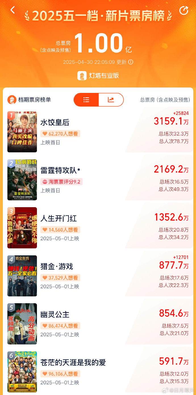 据网络平台数据,截至目前,2025年五一档电影新片总票房(含点映及预售)突破1亿元。